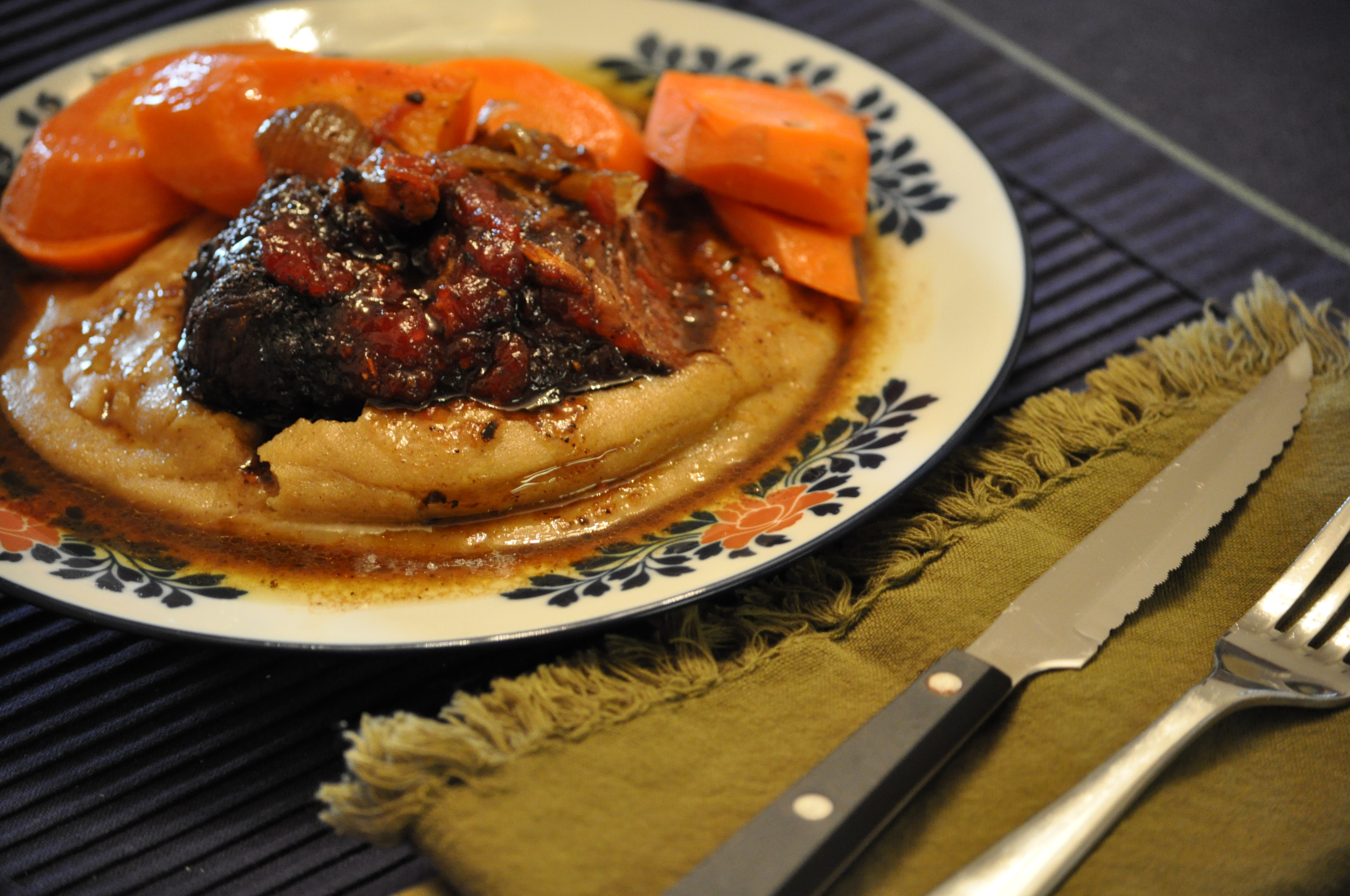 This week I challenged myself to cook items new to me for cooking, but not new from experience in restaurants. Bison, from Gunpowder Bison, and bought at the Silver Spring Year Round Farmer’s Market. Short Ribs, slow cooked in the oven. Served over soft creamy polenta and with honey glazed carrots.
