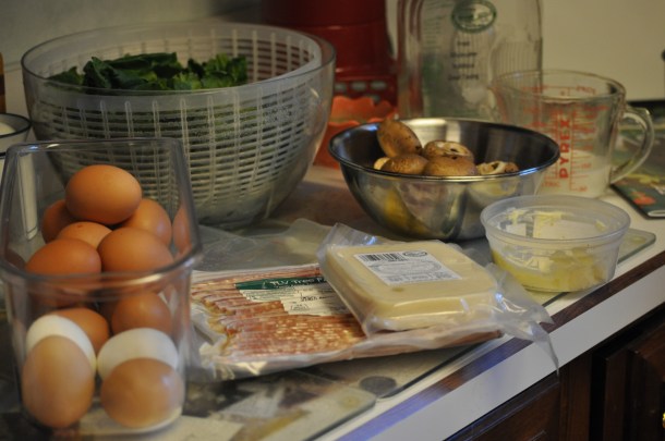 The baby Swiss cheese from a recent visit to South Mountain Creamery along with their milk and unsalted butter is going to be used for this 5 egg omelet. I am getting my biweekly delivery of eggs this coming weekend from Zahradka Farm CSA so I needed to use up some of the ones from last month. The spinach is from the CSA as well. The mushrooms I picked up at Boarman’s. They are labeled as from our favorite local source, Kennett Square PA. I get these mushrooms most of the spring and fall from the Sandy Spring CSA that delivers to Columbia and to the Conservancy.