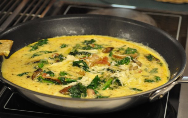 On to the omelet, I cut up some bacon, browned it in the pan, added the veggies and mushrooms, then poured in the egg and milk mixture.