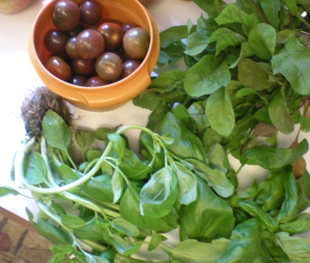 We got apples, spring onions and chard from Spring Valley. It is so good to see spring onions. I love them with microgreens, like the ones in yesterday’s CSA delivery. Down to Firefly Farms for cheese, and Mock’s Greenhouses for the wonderful cherry tomatoes, hydroponically grown basil and arugula.
