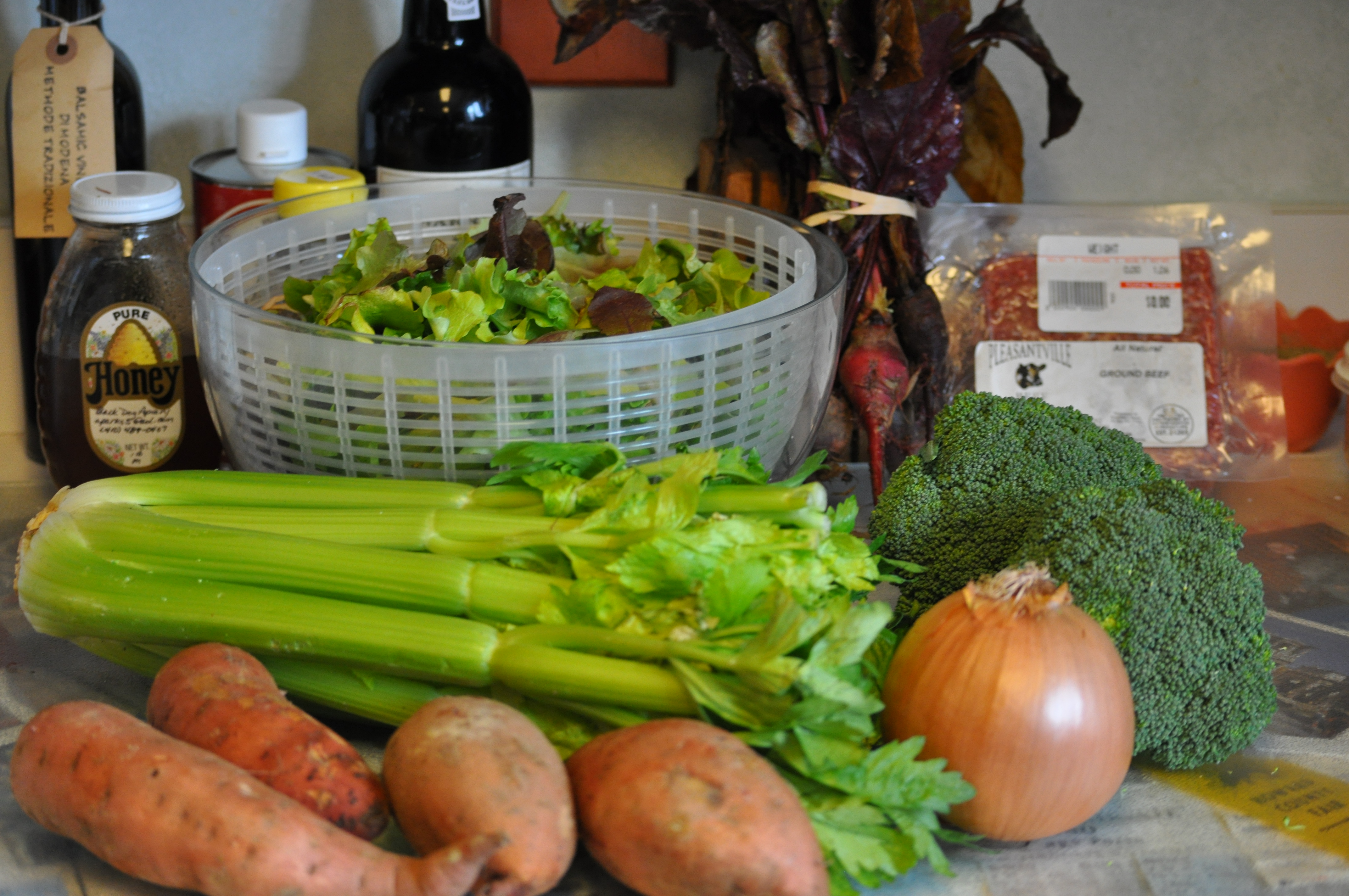 Friday Delivery CSA – beets, onion, sweet potatoes, celery, microgreens, broccoli, and Angus ground beef.