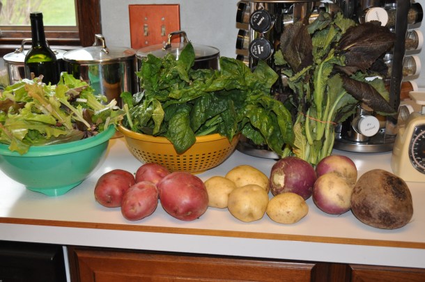 About 3 pm, the cooler lid was closed. I can hear it from the kitchen. That means CSA delivery. Week fourteen with four more left. Two more dozen eggs to come. Four more deliveries of fresh meat. Then, a week of nothing, followed by the start of my spring/summer CSA at the Conservancy.