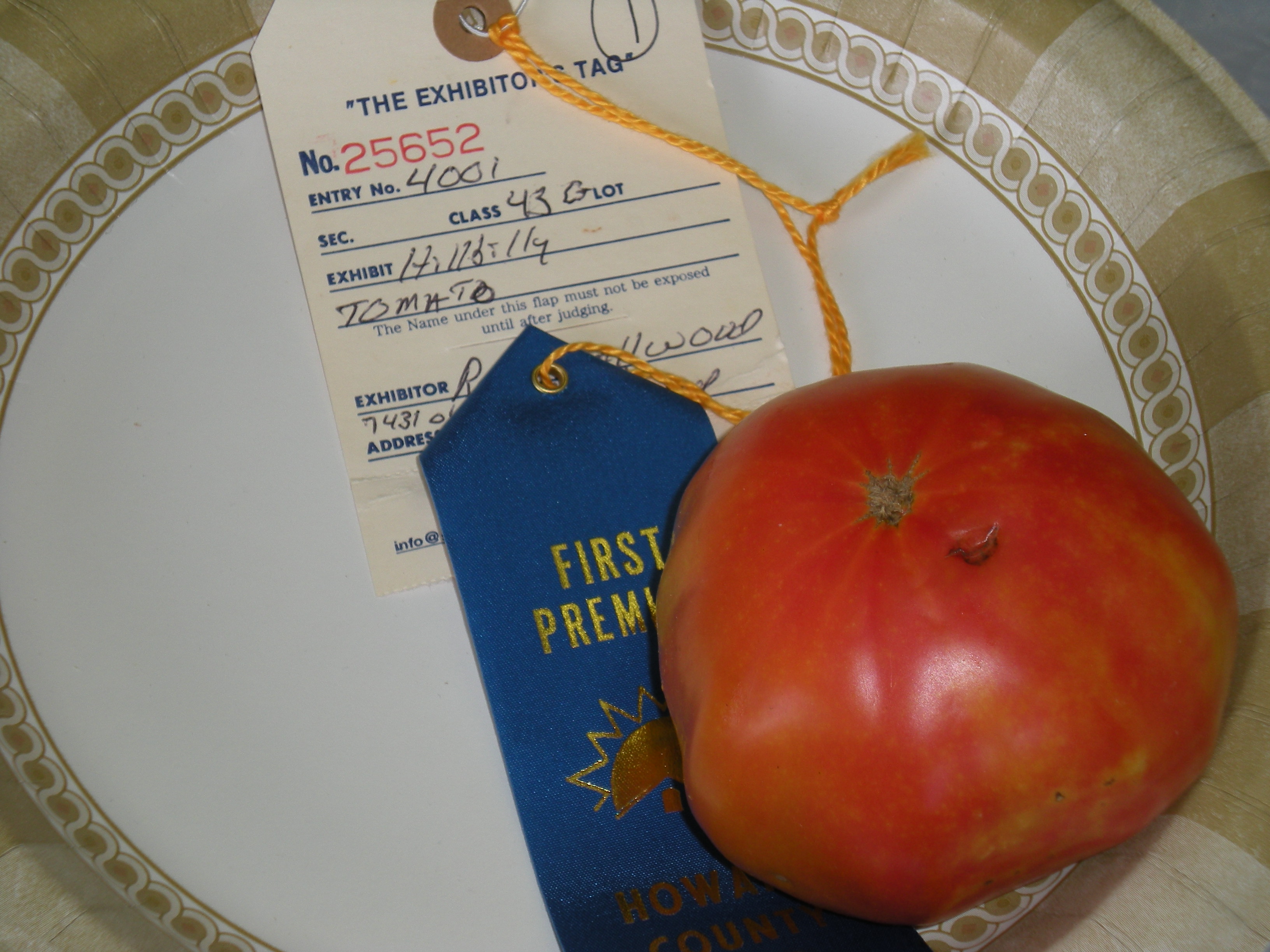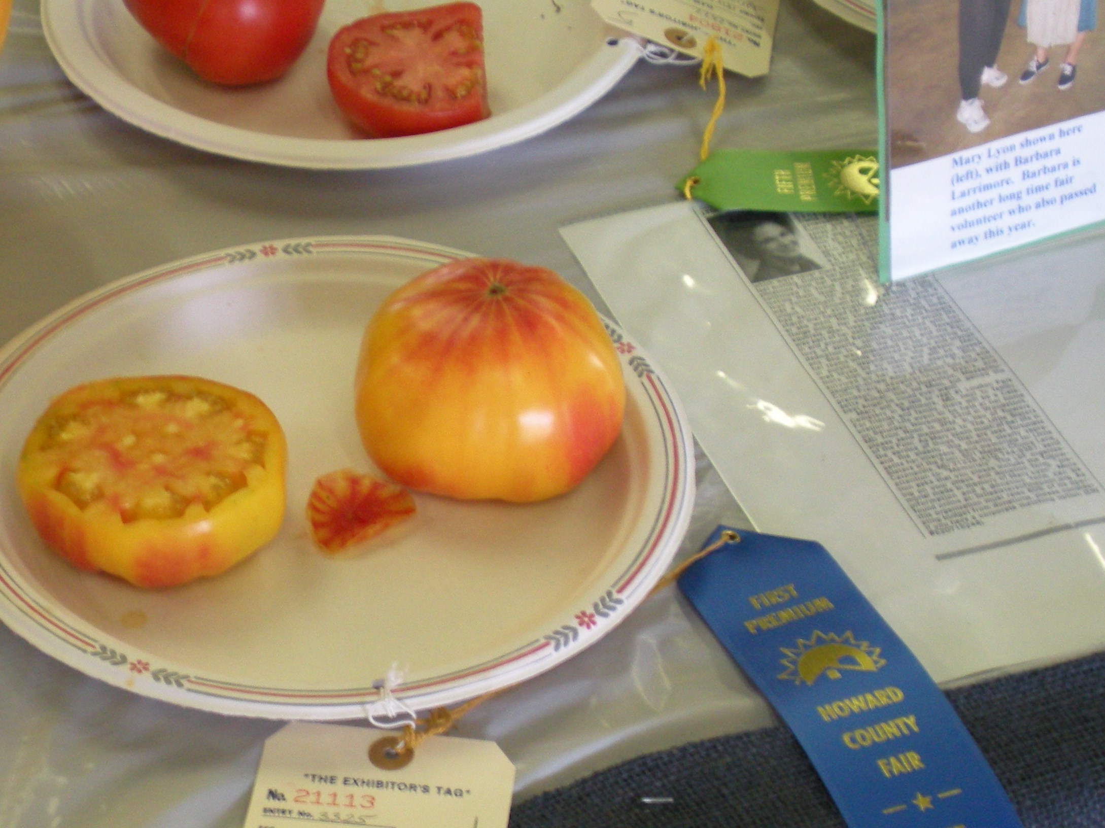 My mortgage lifter at the fair. Looked good. Tasted, eh, too watery. The later harvested tomatoes that grew in late September and early October had much better acid and taste.