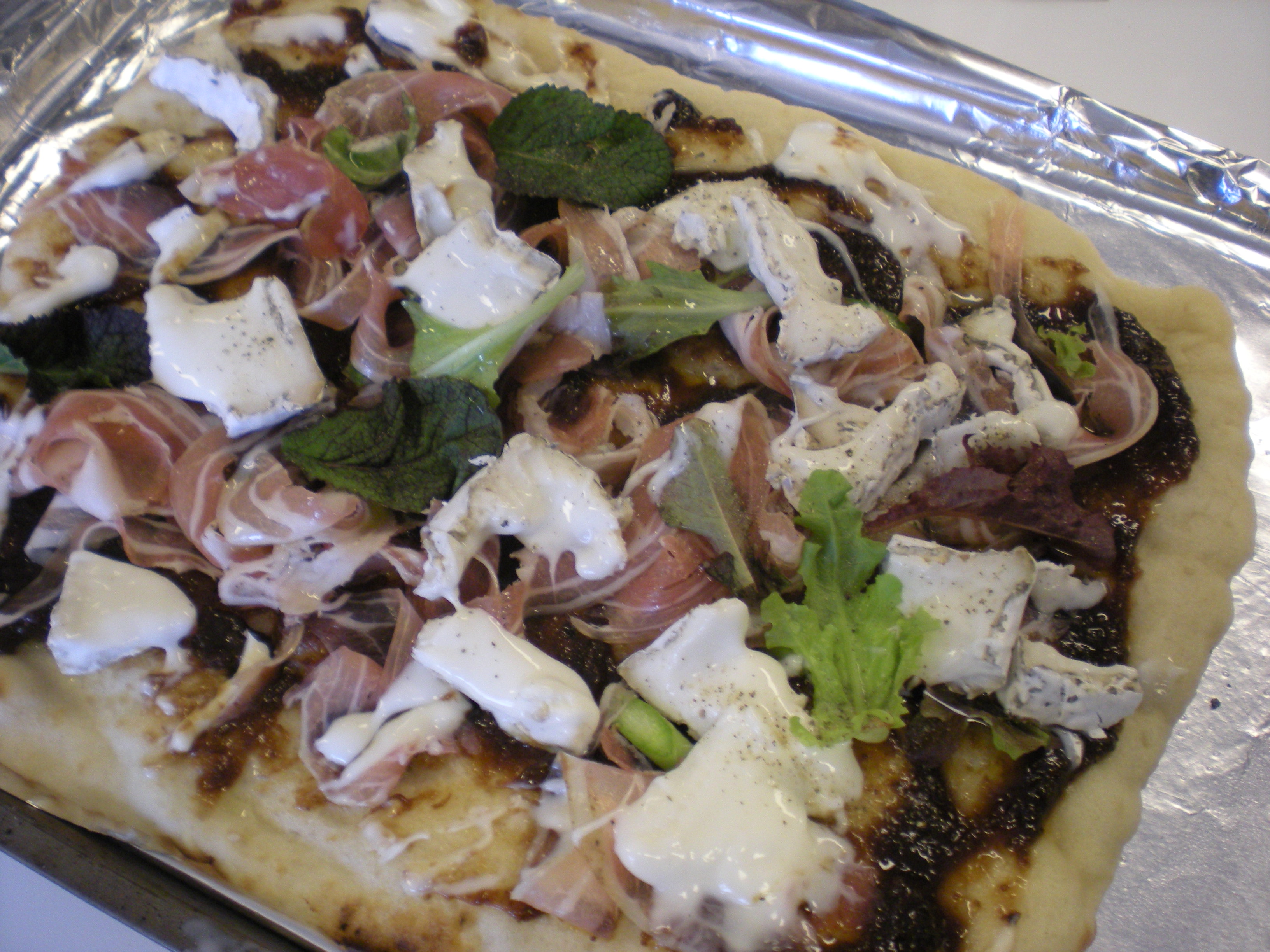 Pancetta, bought at David’s Natural Market. The pizza crust came from Roots. The fig butter was in the fridge, and from Trader Joe’s.