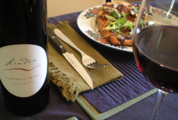 Dinner was served with a 2002 Linden Cabernet Franc, still hanging in there after ten years. Full of fruit, a hint of smoke, not tired or fading. No bell pepper taste that Virginia francs sometimes exhibit. This lovely wine balanced the sweetness of the fig butter, the saltiness of the pancetta, the earthiness of the cheese, and the tang of the greens. What a great combination and a satisfying meal, NOT courtesy of boxed supermarket pizza.