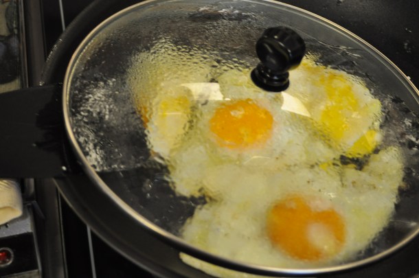 I have perfected my sunny side up skills by using the trick of putting a lid above them to just set the yolks without them getting hard.