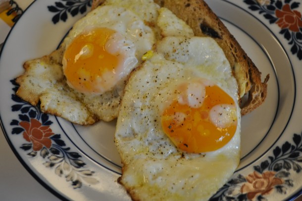 My CSA eggs, sunny side up, from Zahradka Farm, made with Trickling Springs butter, and served with buttered Atwater’s olive bread toasted. You can get Trickling Springs butter all over the place now, the organic markets as well as at Atwater’s in Catonsville. I thought I still had sourdough bread in the freezer but only olive bread left. Time for a trip to Catonsville to get a few more loaves to freeze. They work great that way. Get them sliced and put them away wrapped in foil. Pop in the toaster and enjoy.