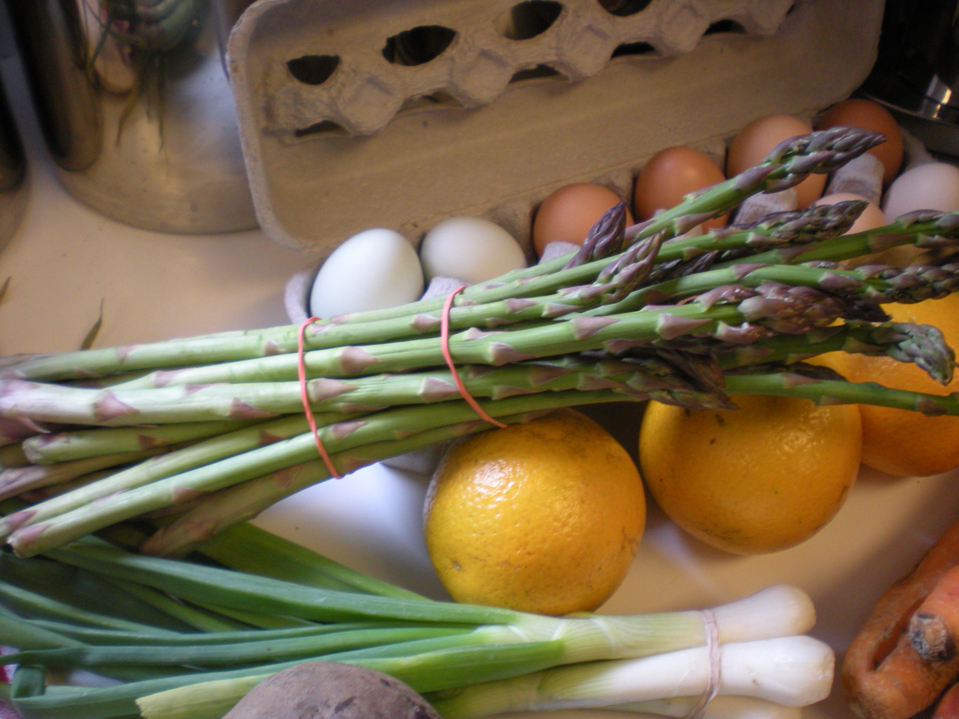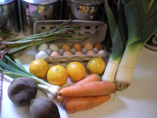 Since I got the CSA delivery yesterday, I realized I needed to do something with all the goodies, from this week and last. The freezer is bare of stocks. I used the last one for soup a week ago using chicken thighs I bought at Roots. I also had eggs galore and beets from this week.