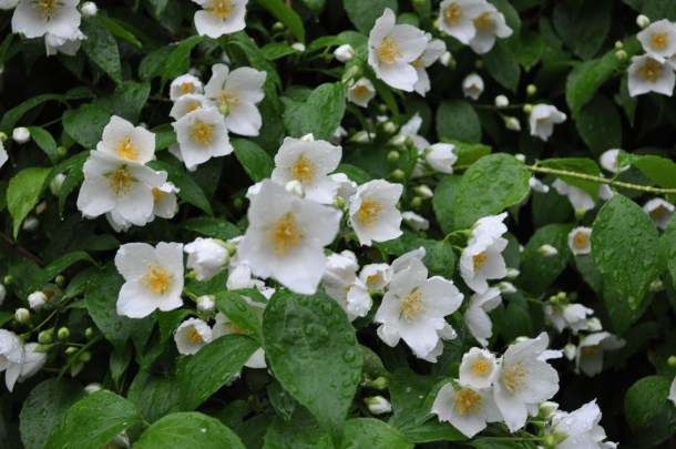 The mock orange shrub out by the well is gearing up to blaze us with white and yellow flowers.