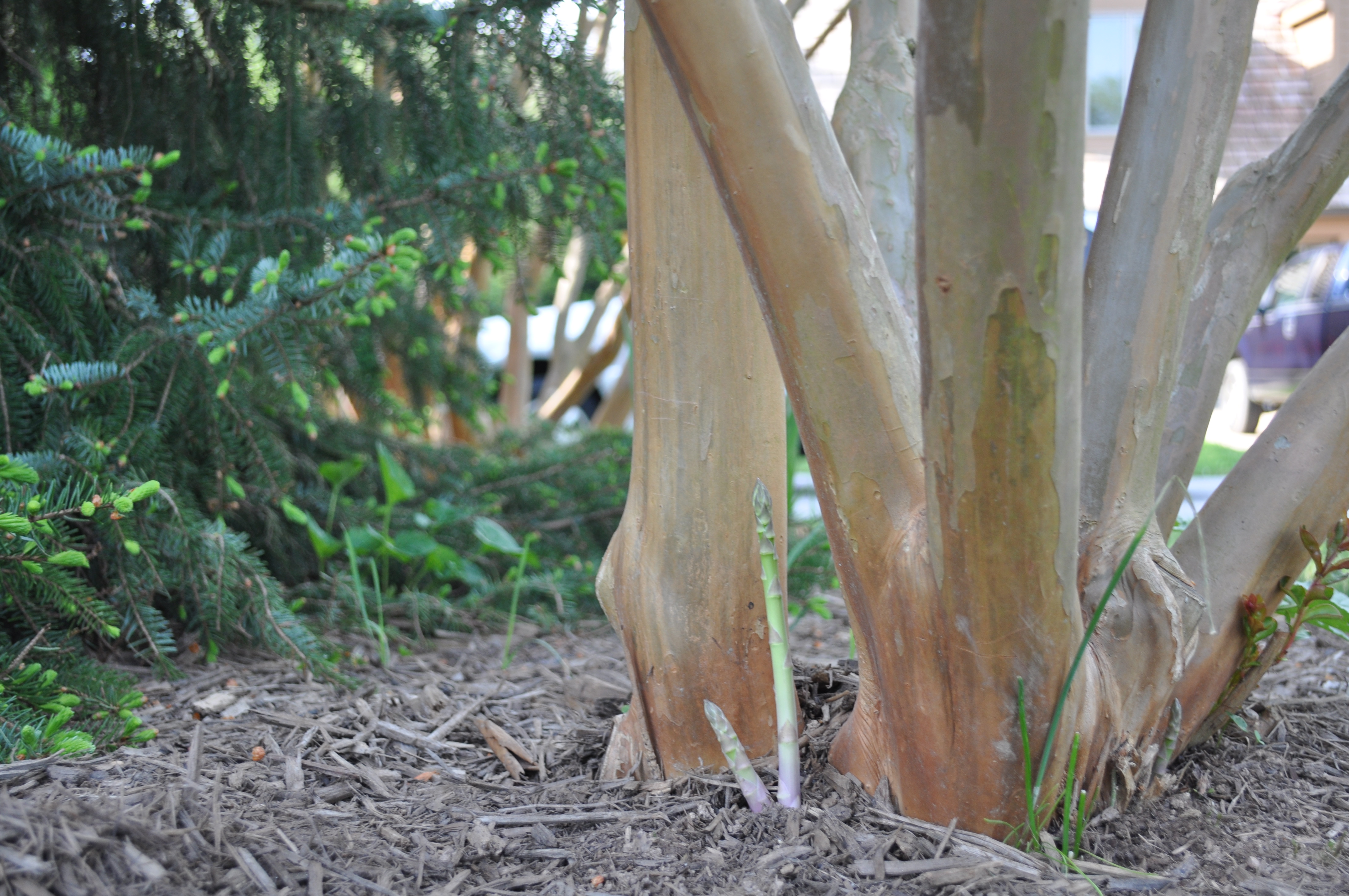 As for the foraging, slowly I am finding single spears of asparagus out under the crepe myrtle. I now have four. By the weekend, two more and then maybe asparagus risotto will find its way on the menu.