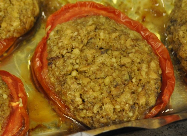 As for current goodies, tonight we had plum tomatoes from David’s stuffed with homemade pesto. A hearty, killer pesto made with greens from the CSA, walnuts, parmesan and olive oil. Not that pretty, but so tasty.