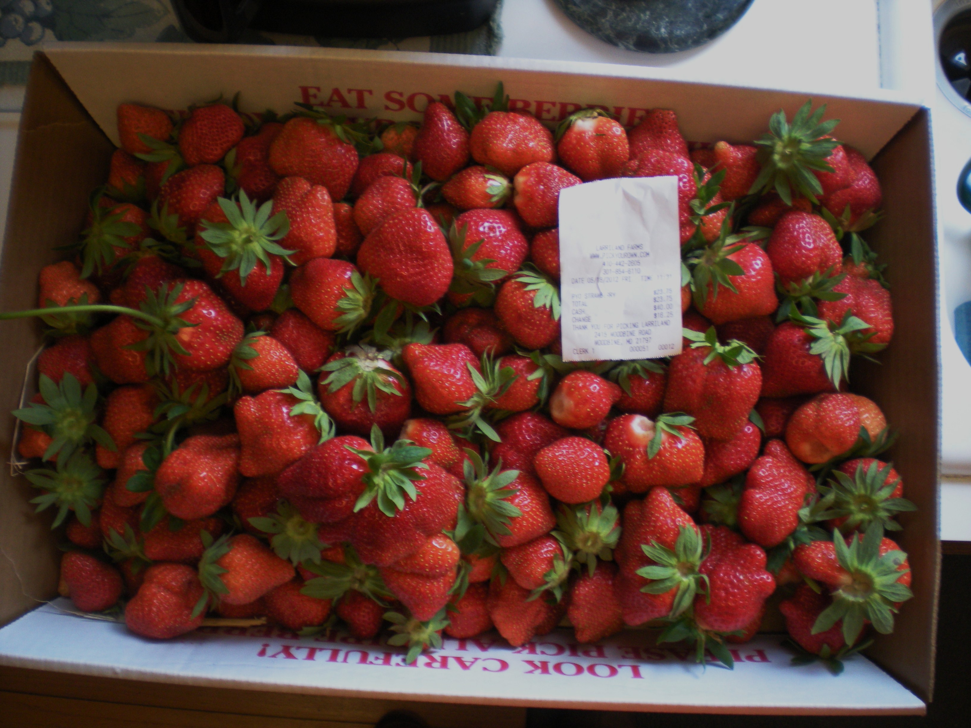 OK, this is only nine pounds of strawberries. To do twenty and get the discount was way too much work. I did forget there was no school today as there were families all over Larriland on their opening morning.