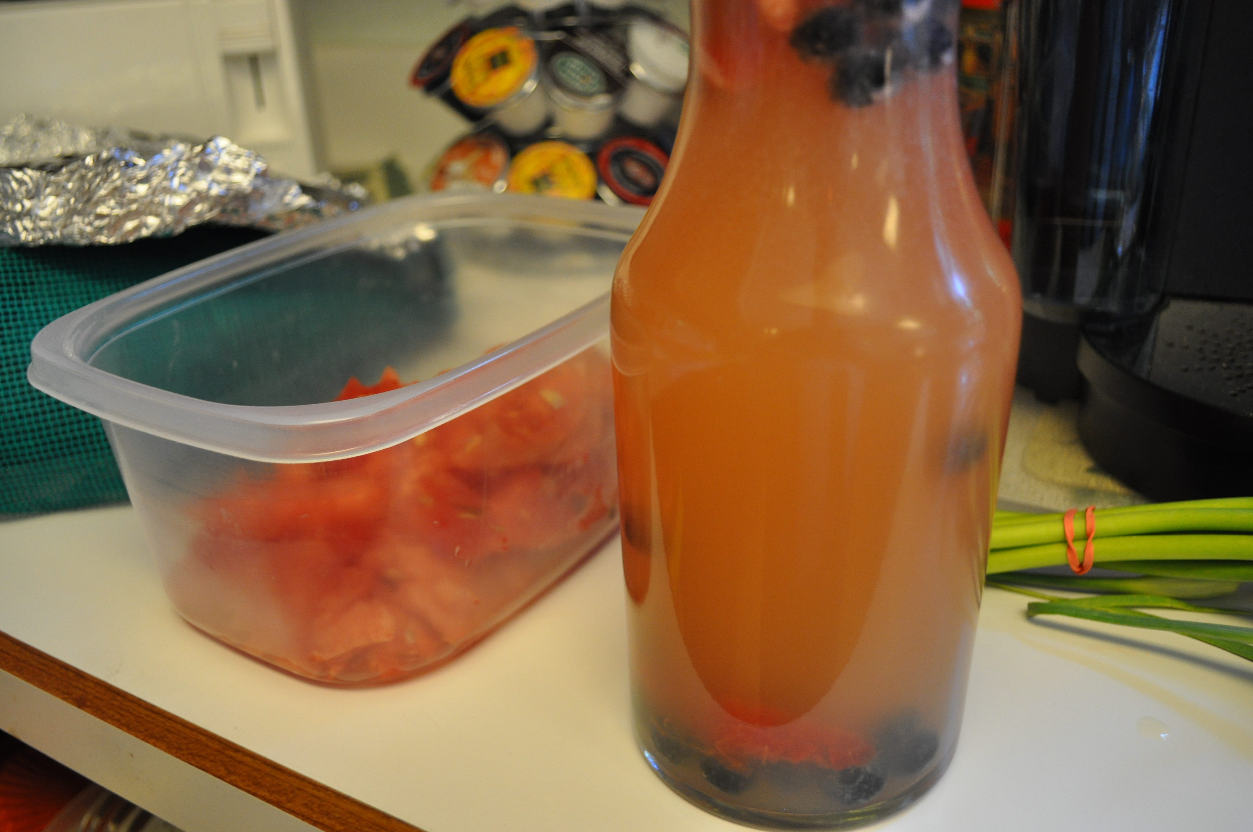 I keep a container of cut watermelon in the fridge. Great to snack on after working outside. The accumulated juice, after being strained, makes a great addition to wine and orange soda, for sangria.