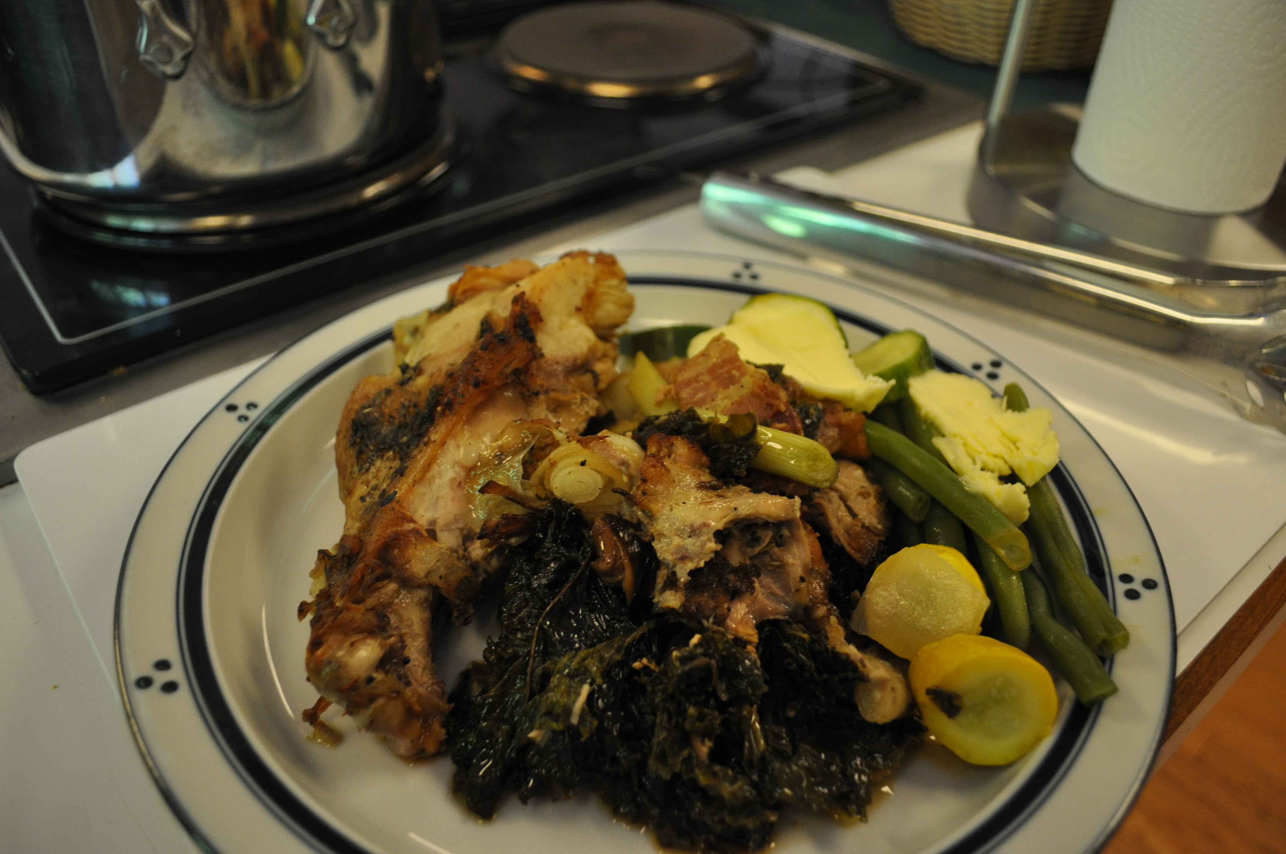 We heated the turkey wing and kale casserole that I made last night, and added the steamed veggies to make tonight’s local dinner.