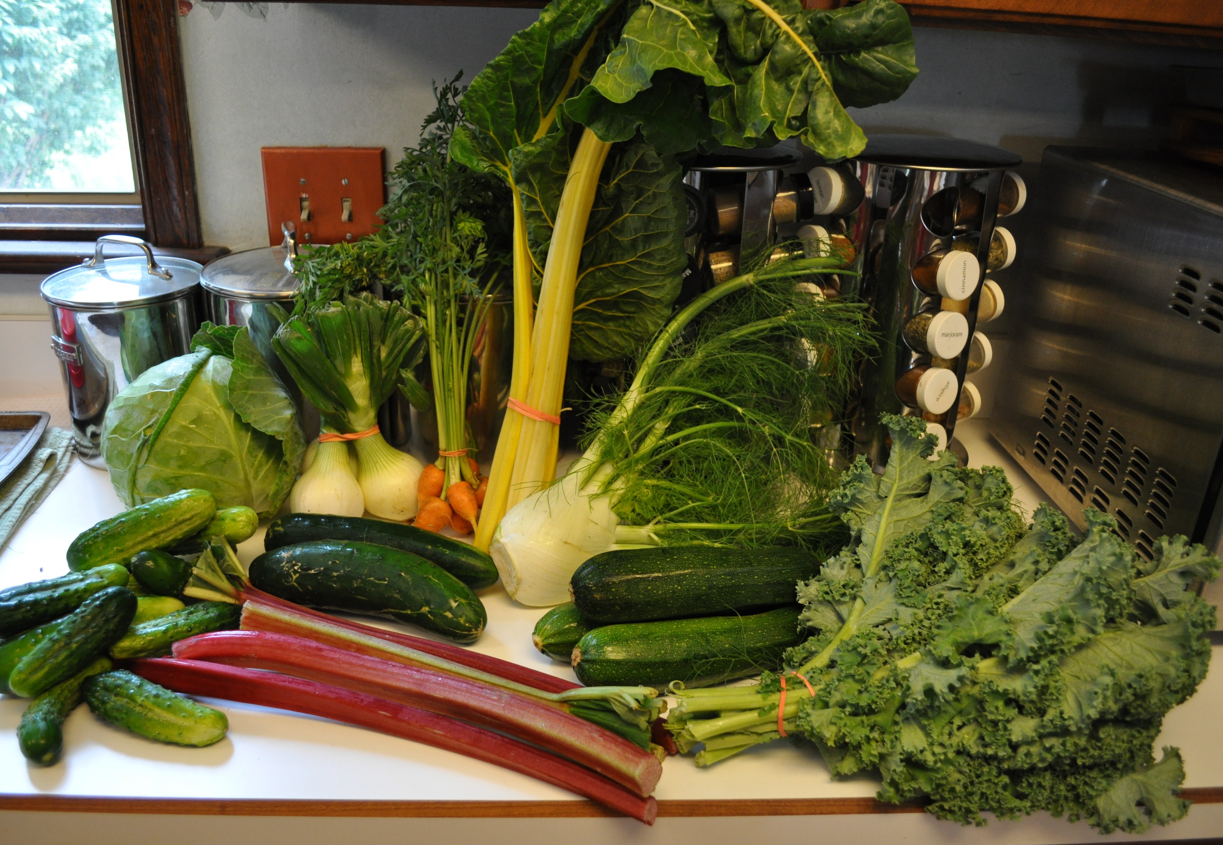 The analysis. Based on organic pricing. Green Kale $3. Yellow Chard $3. Pickling cukes, eleven of them at 2/$1 is $5.50. Heirloom carrots (priceless 😉 ) where else do you find this sort of carrot — $3. Onions $3. Fennel $3.50. Zucchini $3. Two slicing cukes $2. A pound of rhubarb $3. Large green cabbage $3. Total is $32. $3.25 more than the weekly cost of the CSA. Running cumulative total is $51.90, with eighteen weeks to go and so much goodness coming into the house.