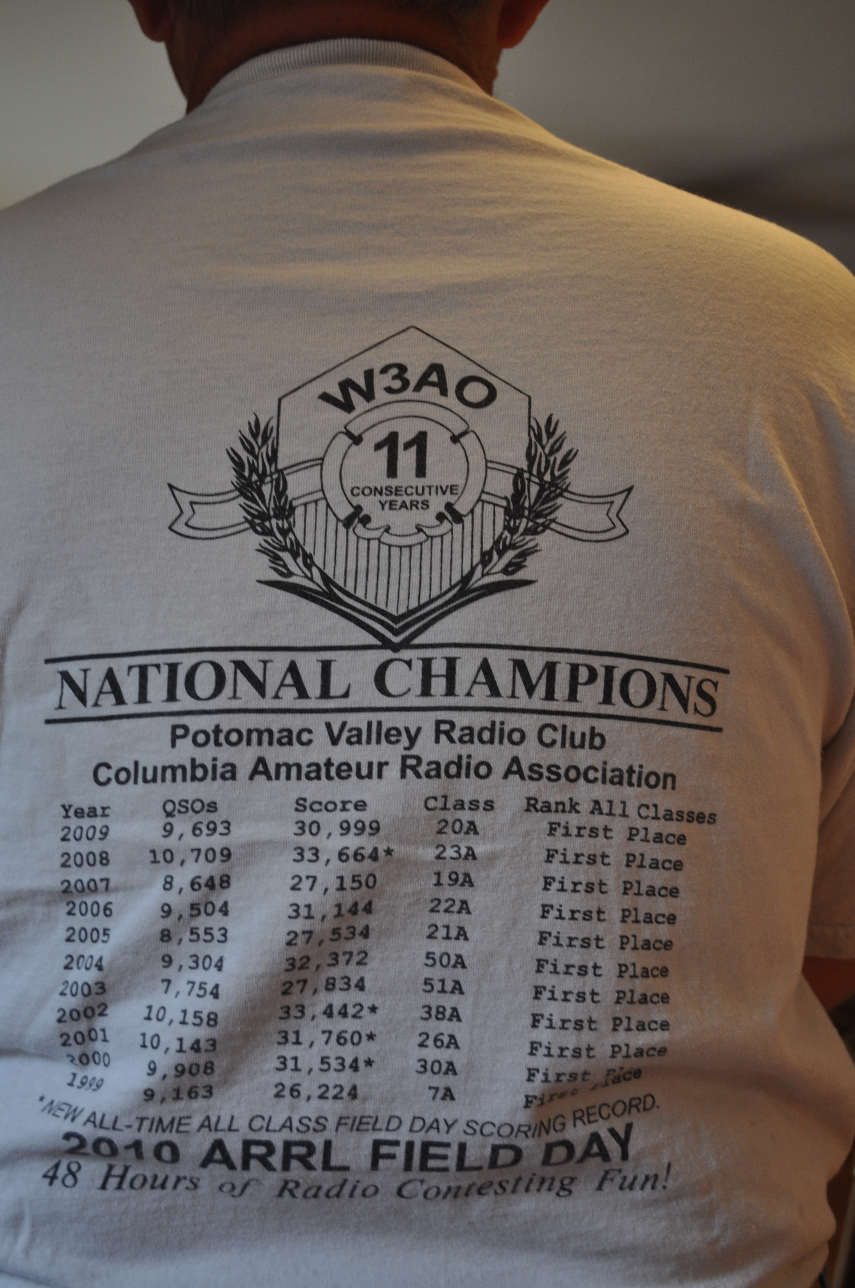 We have one of the largest and most innovative collaborations here in Howard County.The T shirt from 2010 shows 11 years of making the most contacts in our class. This year’s shirt is simple. Front and back alike with no scores. But, we are now at 13 years running of working the most stations and last year set a new record for number of contacts. This is pretty much a Type A personality group. Striving for better performance year after year.