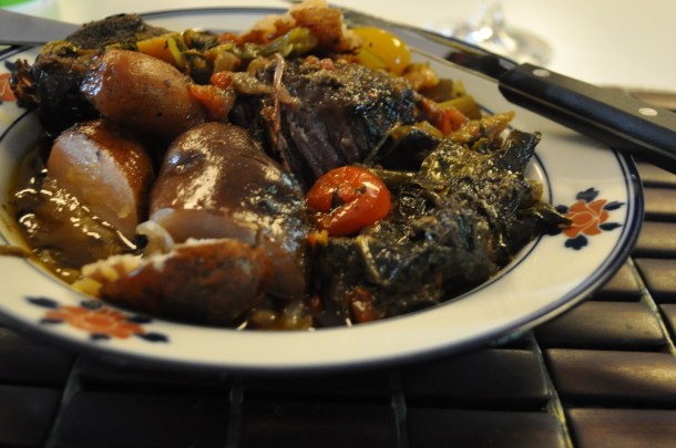 There are potatoes, onions, carrots, kale, chard, beet greens, carrot tops, garlic and a couple of farmer’s market tomatoes in the pot. A little chicken stock for liquid. Herbs from my garden. Topped it off with some Boarman’s short ribs. Let it cook for eight hours. It ended up looking like this.
