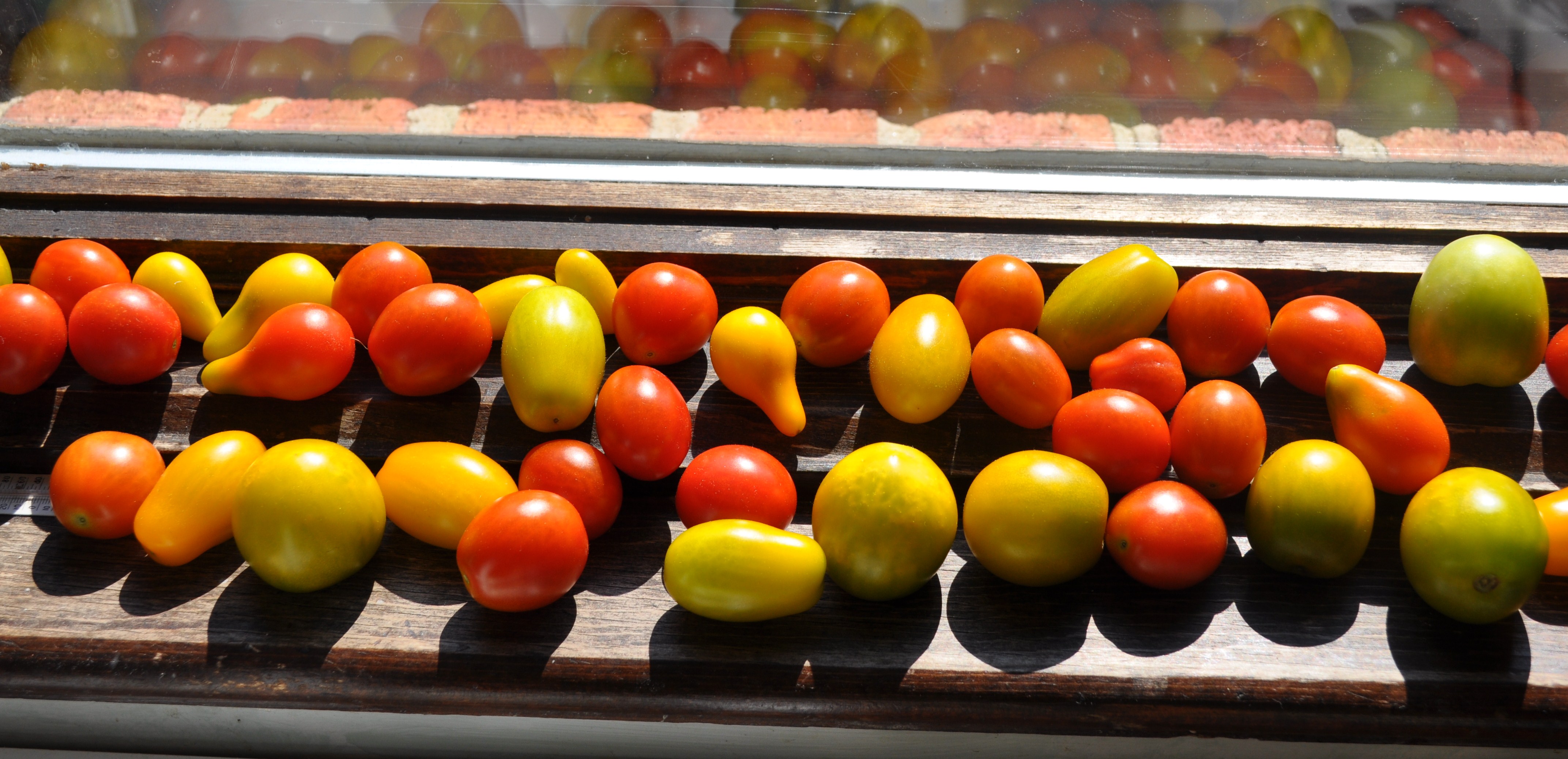 This is my favorite view in the kitchen. Dozens of almost perfectly ripe cherry, grape and pear tomatoes all reaching their peak of ripeness in the morning sun.