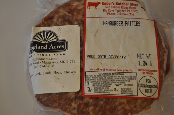 We also took England Acres ground beef to make hamburgers, and topped them with Eve’s Cheese smoked cheddar, bought at England Acres Farm Store in Mt. Airy. There are no pictures from the picnic since I forgot my camera. Just the package that is in the freezer of the same ground beef patties we used last night.