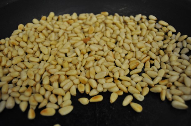 I dry toasted a cup of pine nuts in a skillet to add to the basil. I then added 1 1/2 cups of parmesan and drizzled olive oil into the processor. Salt and pepper to taste and five cloves of garlic.