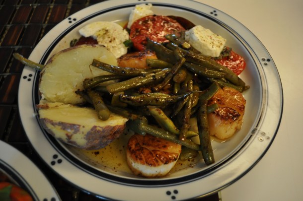 The potatoes were microwaved. They came from my CSA. The beans were steamed, then finished in the pan with butter and the scallops. The mozzarella came from Roots. The chocolate stripes tomatoes were from my garden, as was the blue basil.