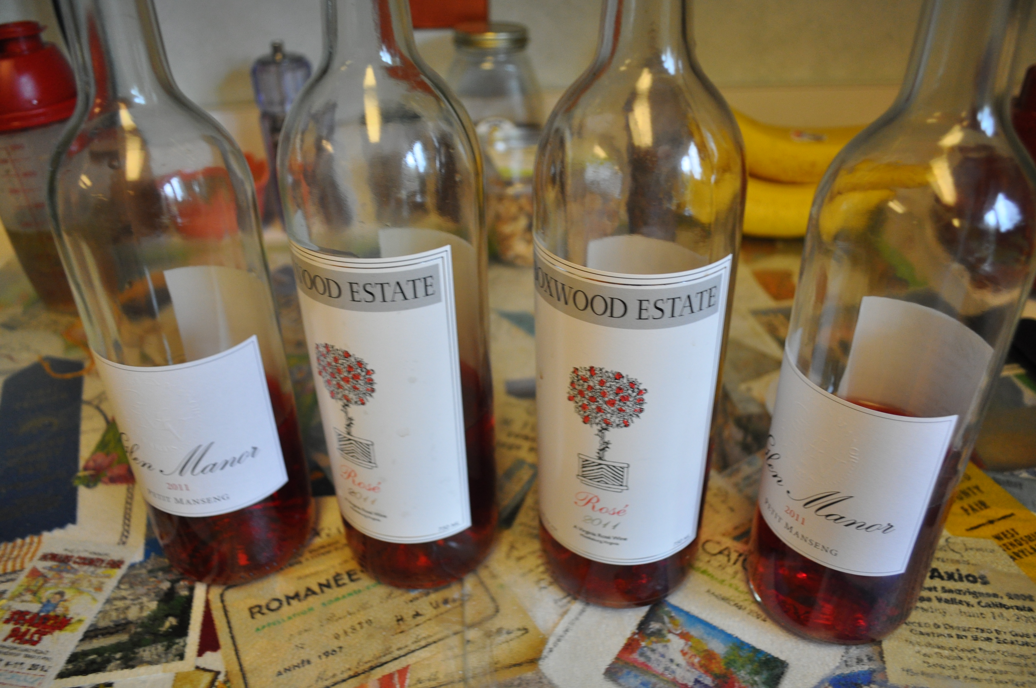 The hummingbird feeder is a simple design that uses wine bottles, and as we all seem to know around here, I certainly empty my share to make their feeders. I keep them in the small refrigerator in the laundry room after I make a quart of nectar. Hopefully, no one goes in there and mistakes them for wine.