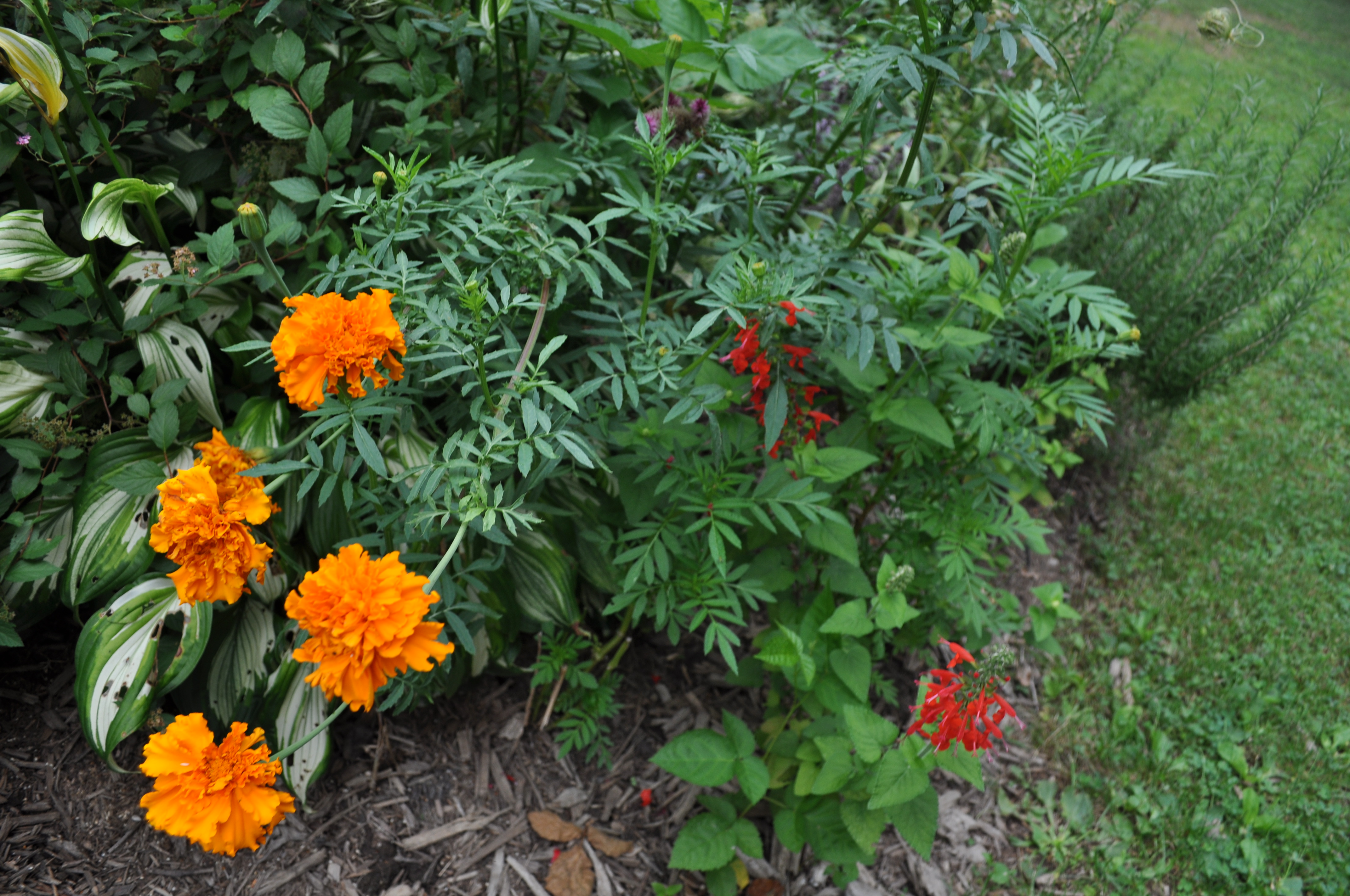 I wandered out and checked on the herb garden, which now has marigolds all around it. They didn’t bloom in time for the fair, but are putting out a nice amount of flowers that I can cut and use on the table.