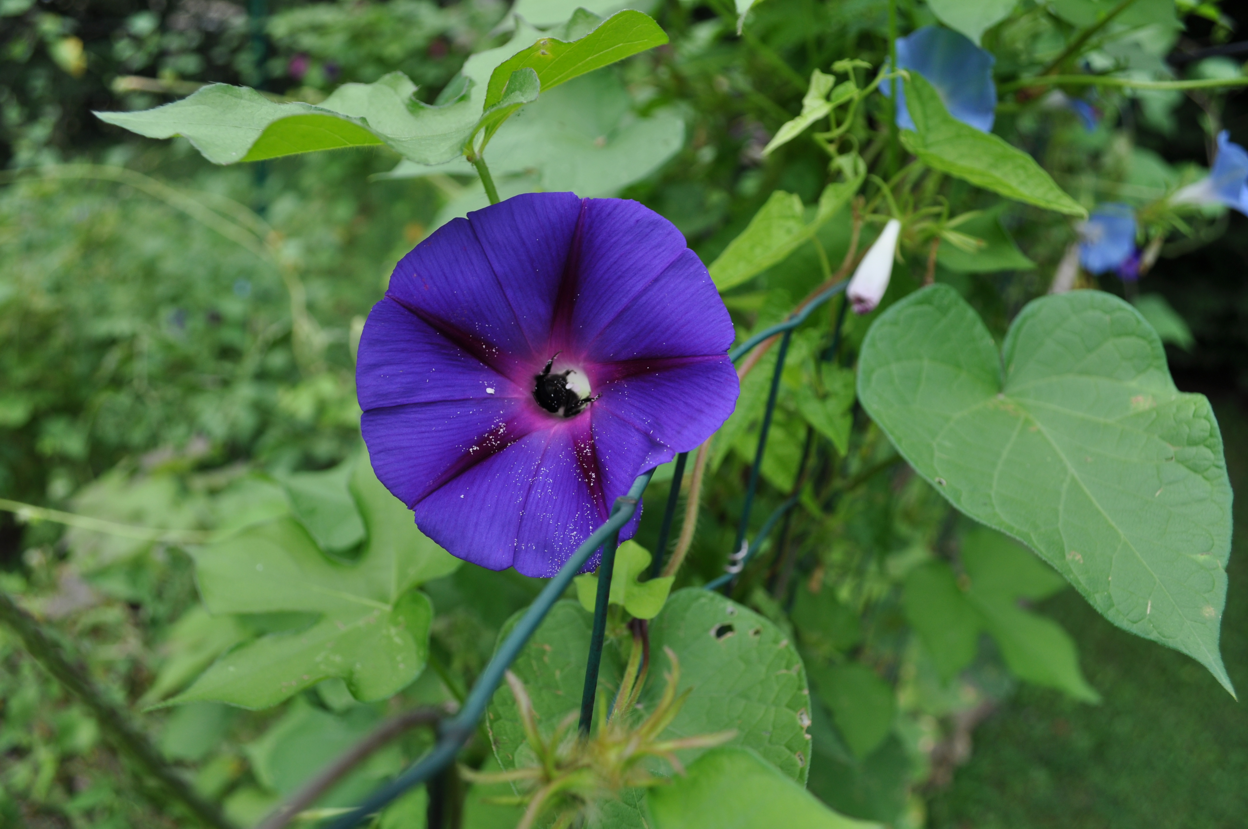 Now, the garden. The garden is a mess. I found that weeds are growing rampant between the backs of the cages and the deer fence. I can’t easily get to them to pull them out. Only weed whack them from outside or try cutting them off by reaching through the fence. Not working. And, the morning glories are out of control. At least the bees love them.