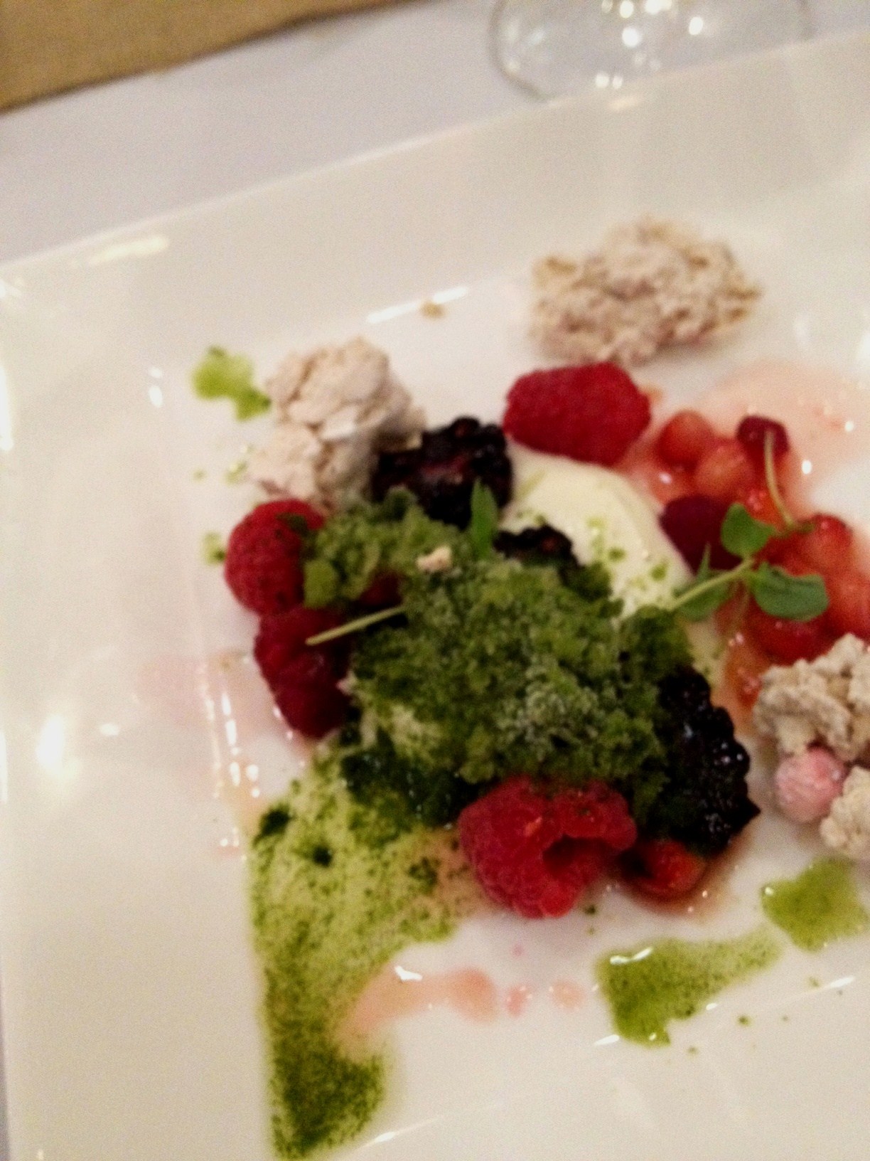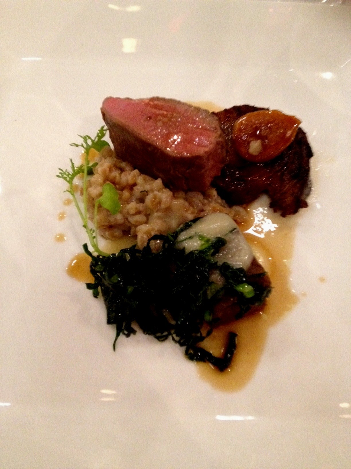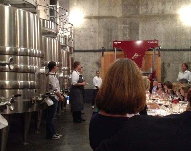 The appetizers were served in the upper level of the winery, below that lovely silo. Trout roe with pork skins and arugula cream, clams casino, an incredible sausage on a delicate cracker, all paired with a Muscadet Sevre et Maine sur lie. Then, we descended into the fermentation cellar to be seated and treated to an amazing dinner prepared by the chef. I only have good pictures of the lamb and the dessert. Here are the stars of the dinner.