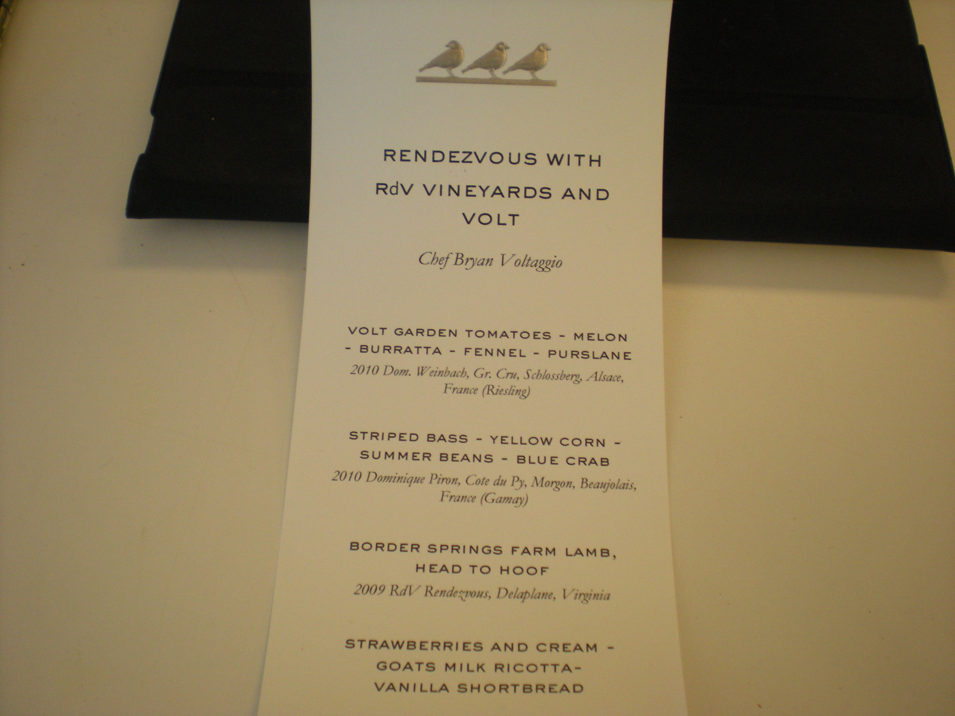 The winery holds chef dinners periodically. We were lucky, as two of the 40 people in attendance to have a celebration of local foods with Bryan Voltaggio, paired with wines whose grapes shared that same granite terroir. We had a Loire white, an Alsatian white, a Morgon Gamay and 2009 Rendezvous, with appetizers and dinner. The menu for dinner.