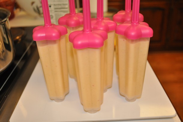 I made a mess of the kitchen, using the blender and the food processor, both of them twice. I swear, I spend all my time doing dishes. Oh, I forgot, I did process two peaches, with yogurt, peach nectar and honey, to make peach pops.