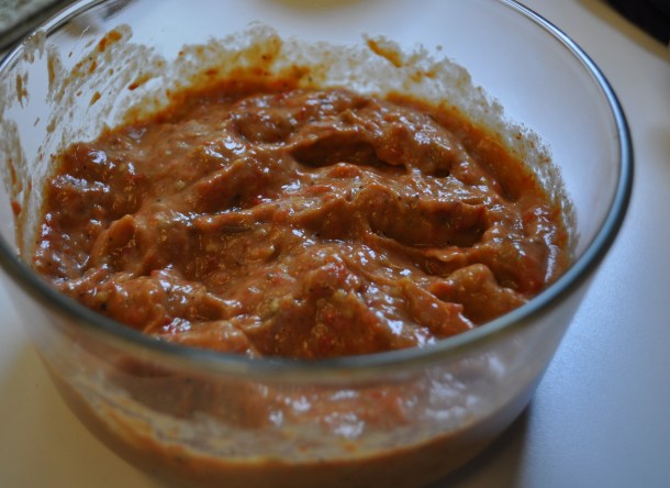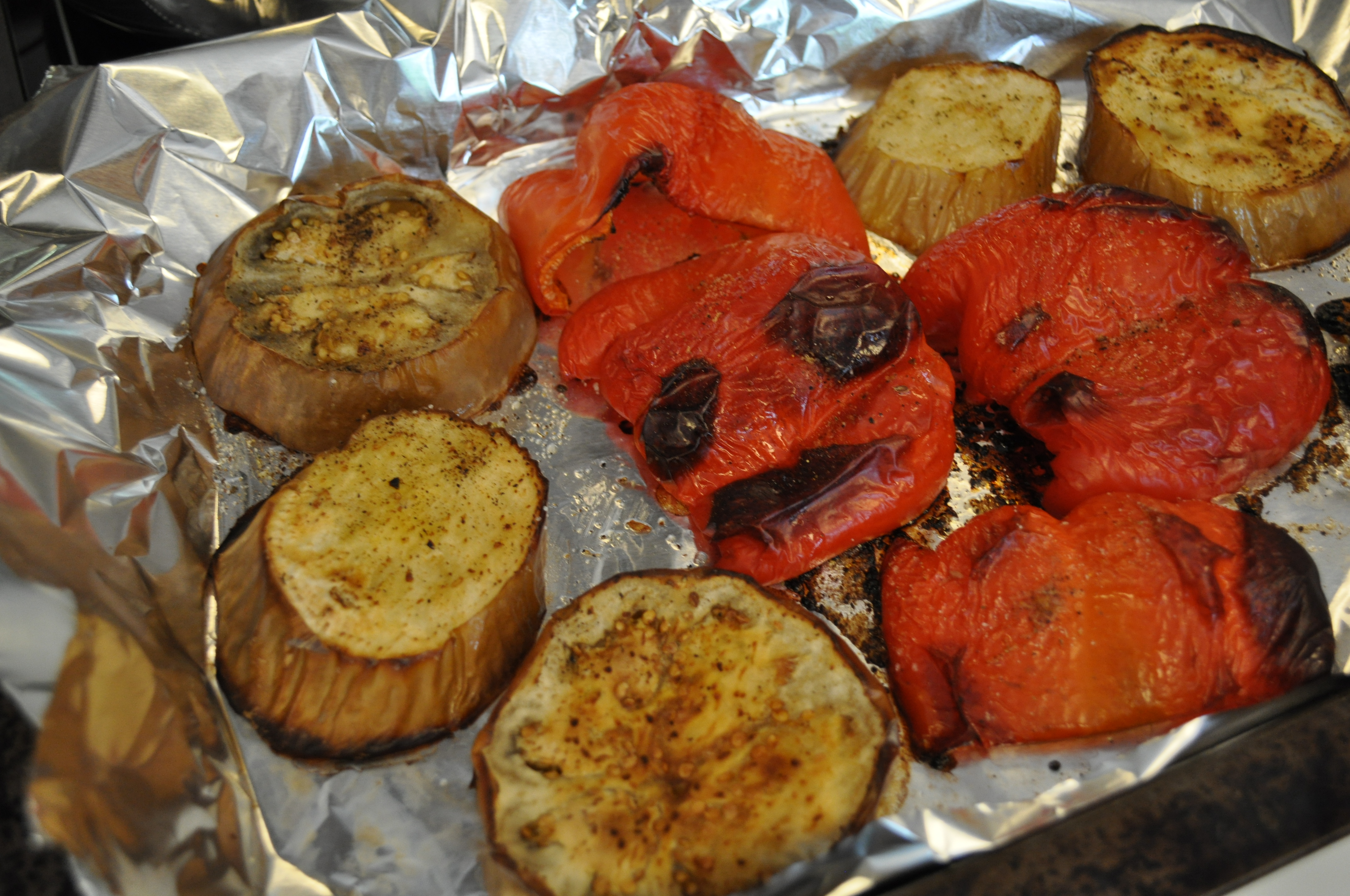 The finished product. So flavorful. Not that hard to make. Roast eggplant and peppers. When done, throw a head of garlic cloves in the oven, after turning it off. Puree all of it in the blender. Add olive oil, salt, pepper and balsamic to make it taste the way you want it.