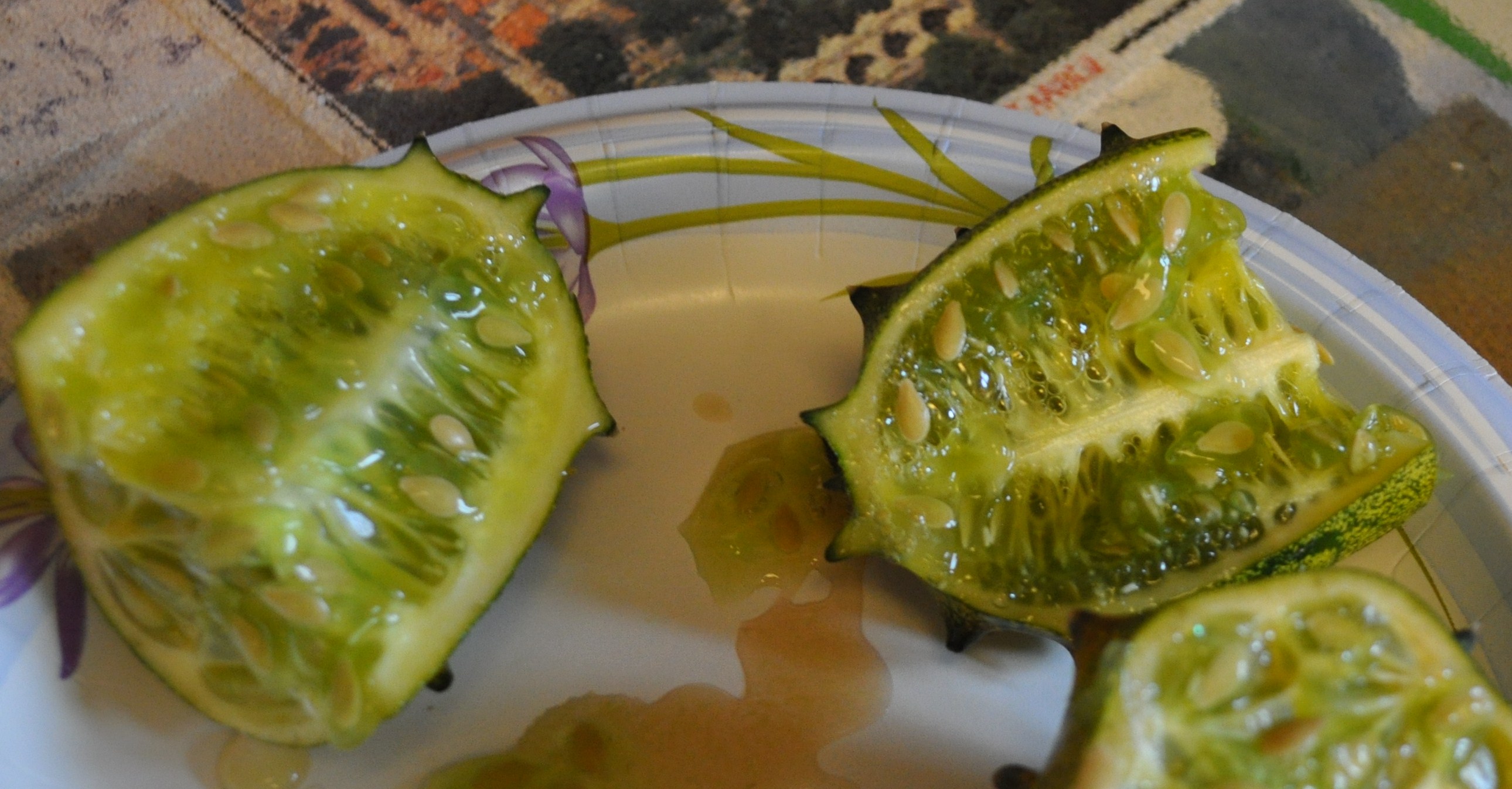 As for last week’s African horned melon, I cut it open yesterday. It looked different, and really didn’t have a strong taste. Let’s say I was underwhelmed.