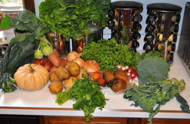 Total for organic veggies comparing it to supermarket prices = $43.50 not counting the kohlrabi. We pay $29.72 a week for our organic box of veggies. Again, we see that buying from the CSA is a good value.