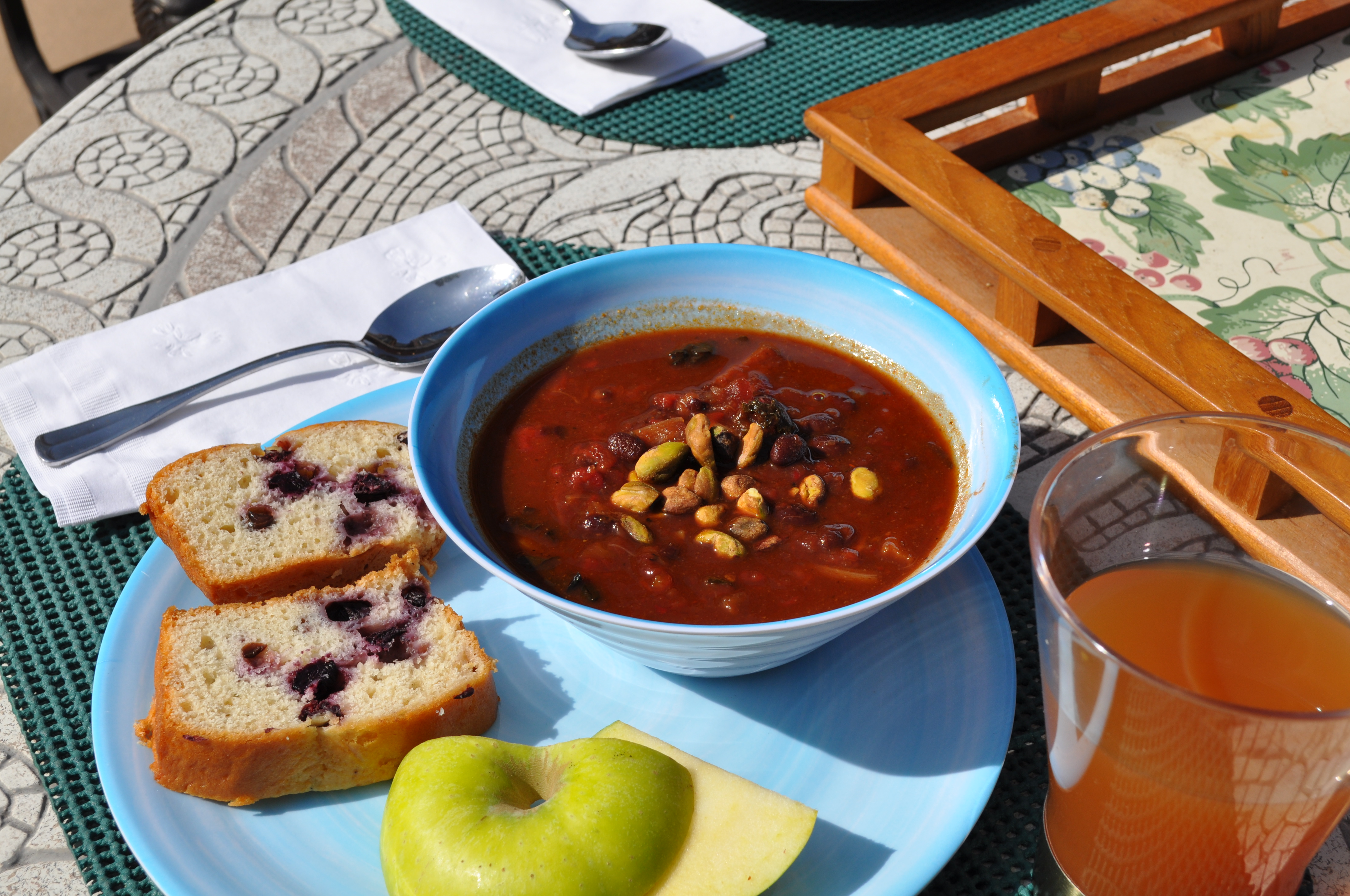 Purple/blue, the first color, includes the blueberries in the dessert bread. Green shows up more than once, but is really present in the mixed greens in the soup. Because the apple was a green skinned apple, it is also included. White/tan, one of the choices that slows the absorption of cholesterol, shows up in the garlic and ginger in the soup. Red checks in via the chunky tomato sauce that I had made this summer and used in the soup. My chunky sauce also includes carrots, but not much, and onions, so orange and white make a tiny appearance in the soup via the sauce.