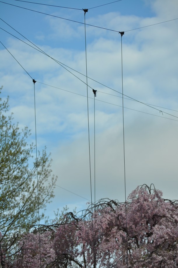 The antennas are all down. The side of the house looks weird with no wires. This is the view from a few months back. Spring when the cherry trees were blooming. All the wires had to come down and tension taken off the ropes so they won’t snap. Here’s hoping the trees all hang in there the next two or three nights.