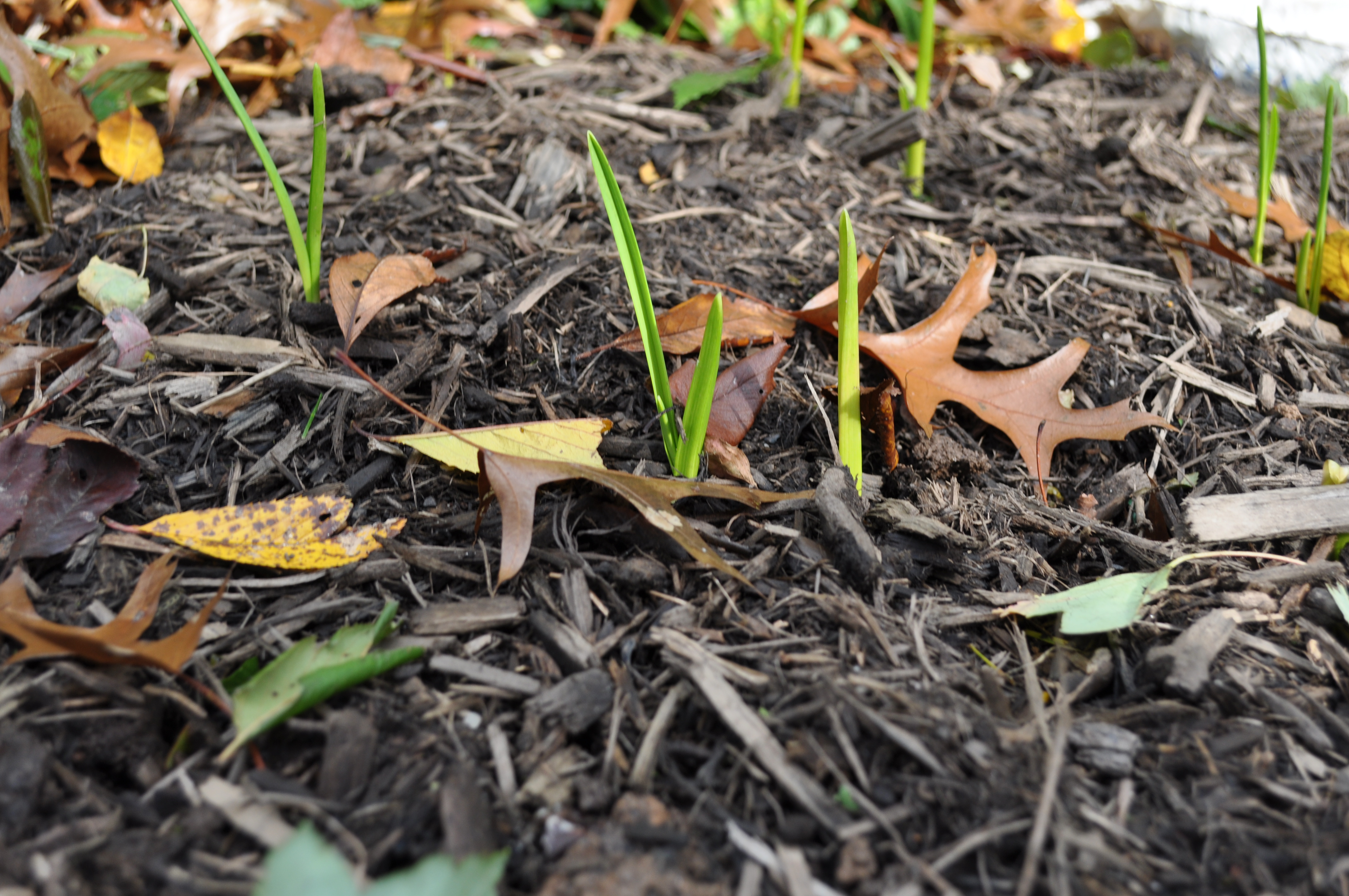 Right now my better half is creating mulch from all the small tree limbs I collected off the property, for me to use to cover the garlic for the winter. The garlic has sprouted, so it needs a warm cover to overwinter. It obviously loved all that moisture the past week and came up with quickly. I noticed it this morning.