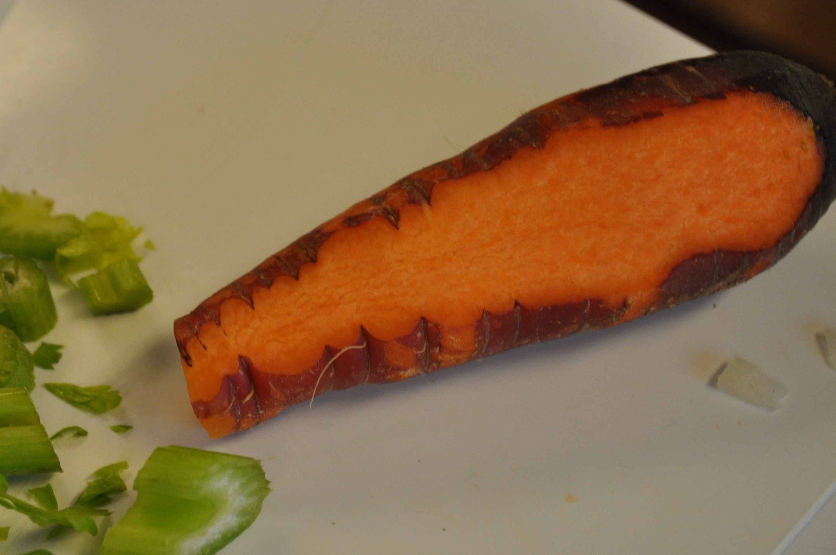 By the way, purple carrots aren’t purple inside. Here is one I was starting to peel. They are really sweet, though. I love them shaved into salads, too. But this one and another made it into the pot.