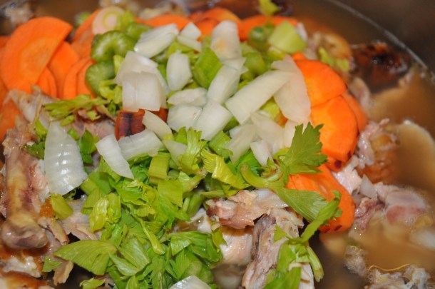 I added the trilogy. Celery, carrot and onion. Two carrots. One onion. About half a cup of celery. That’s it for now.
