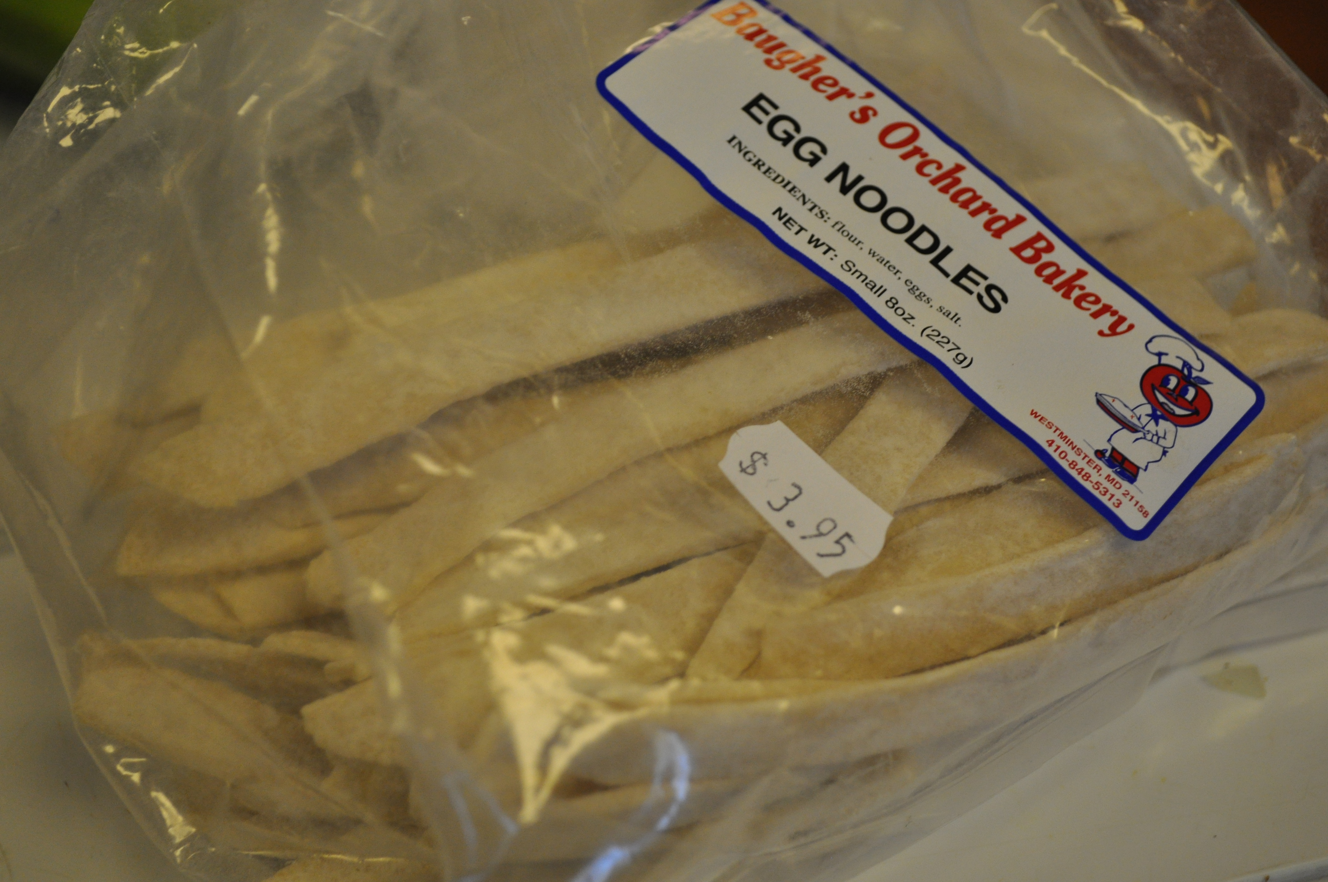As for the noodles, they will go in just before I serve the soup. Only staying in for a few minutes. These are fresh egg noodles from Baugher’s in Westminster. I love these noodles. Four simple ingredients. Oodles of taste.