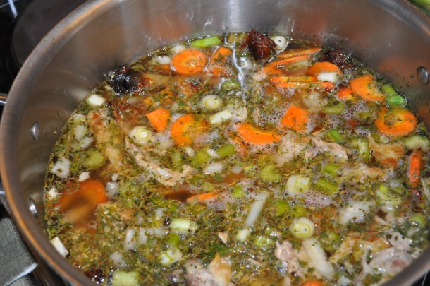 I started with about half the chicken, including all the bones, the skin and shredding the breast meat before adding it to three cups of chicken stock and two cups of water. For herbs and spices, I used tarragon, salt and pepper, all to taste. I don’t measure herbs.