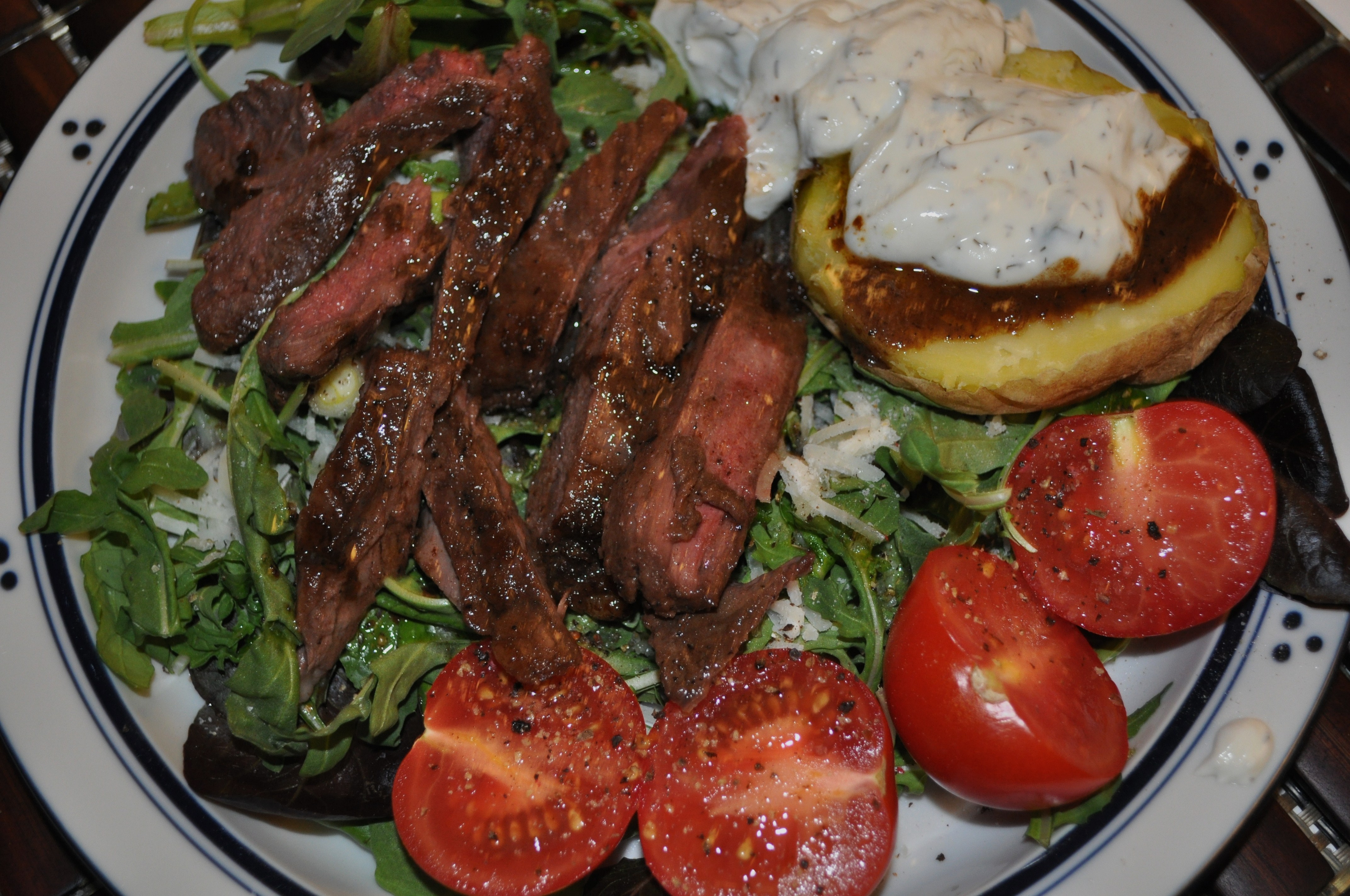 Put together a salad of arugula, microgreens, scallions, tomatoes and added a potato with tzatziki on the side. The salad base is the key. Fresh organic arugula and microgreens from Roots. Scallions from the CSA. Tomatoes were from Costco. I mixed some very old balsamic and olive oil from St. Helena Oil in California to drizzle over it. With this base, dinner only needed a small amount of the slightly rare, dark and juicy steak, and half a potato with the tzatziki on the side.
