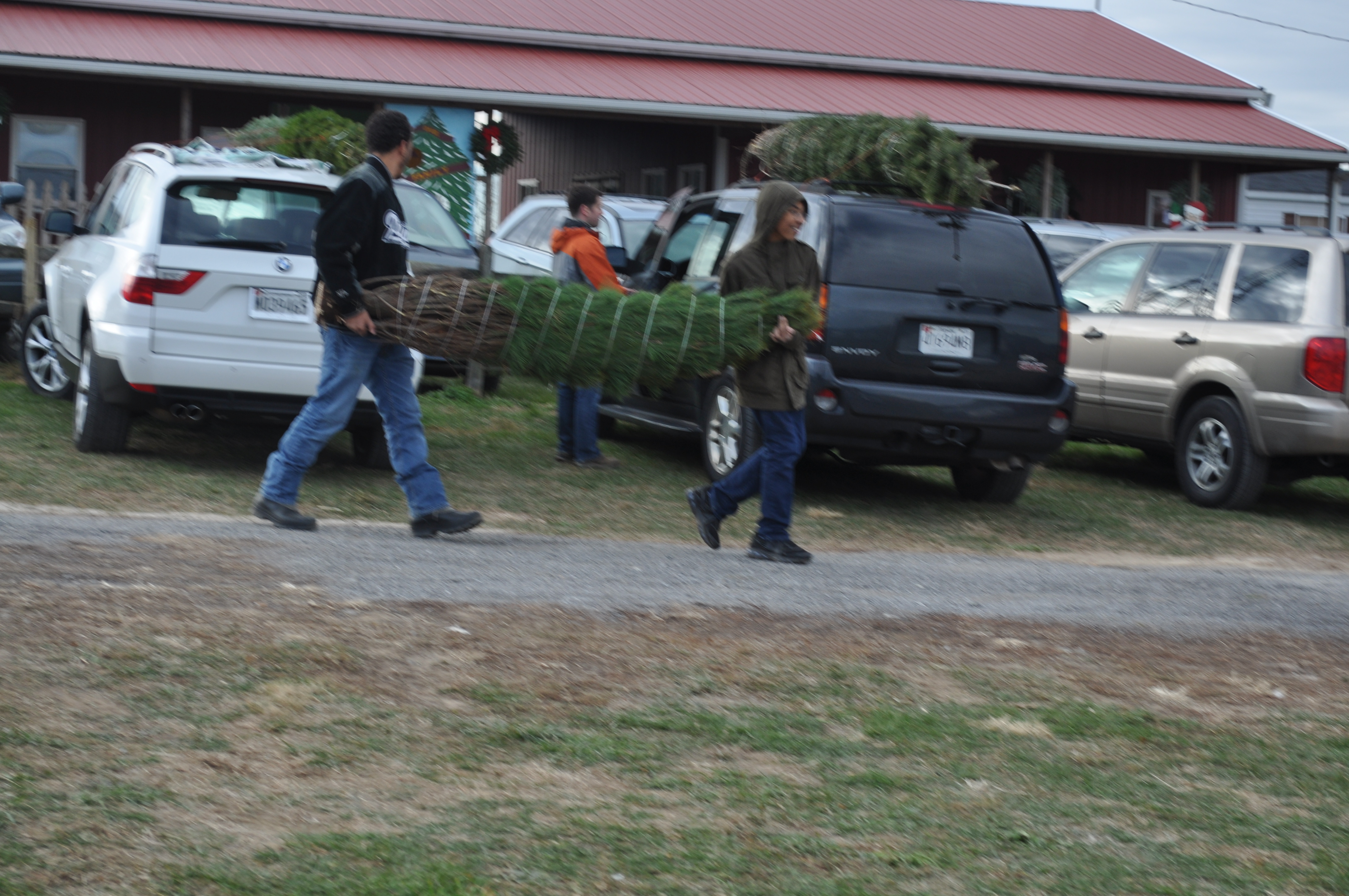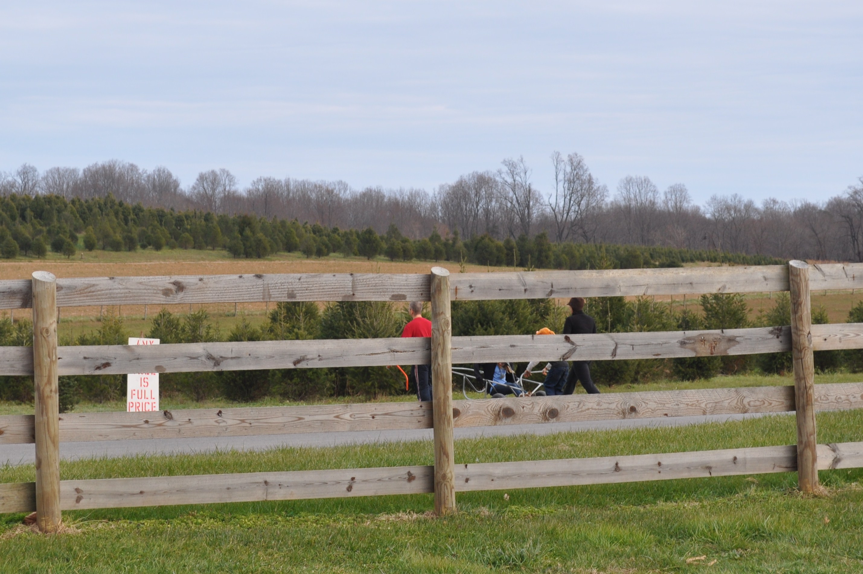 It is easy to get to the farm from Columbia. Take Harper’s Farm until it crosses Rte. 108 in Hobbits Glen. It becomes Homewood. Just keep going straight. The road will change name at the first circle, becoming Folly Quarter. Continue straight through the circle. A few miles later, past Glenelg Country School and Triadelphia Rd merges in. Keep going straight, across the bridge over Rte. 32 and straight again through the circle at the Royal Farms. Lots of people taking advantage of the good gas prices there, with their trees strapped to the tops of their cars. We do have good gas prices out here.