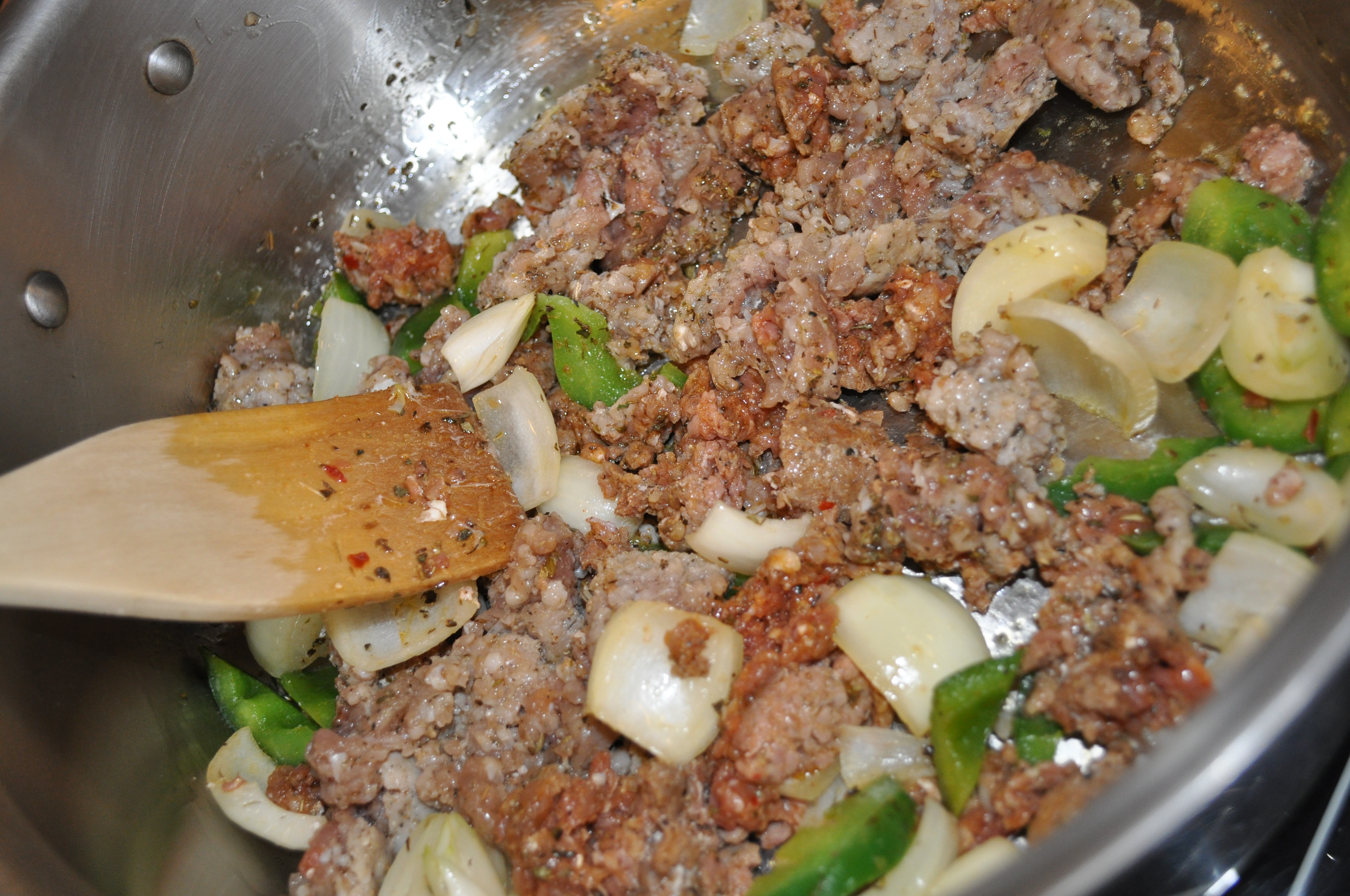 I started with two links of Boarman’s Italian sausage. One sweet. One hot. Put in the pot with onions and peppers. Onions from Breezy Willow. Peppers from Roots.