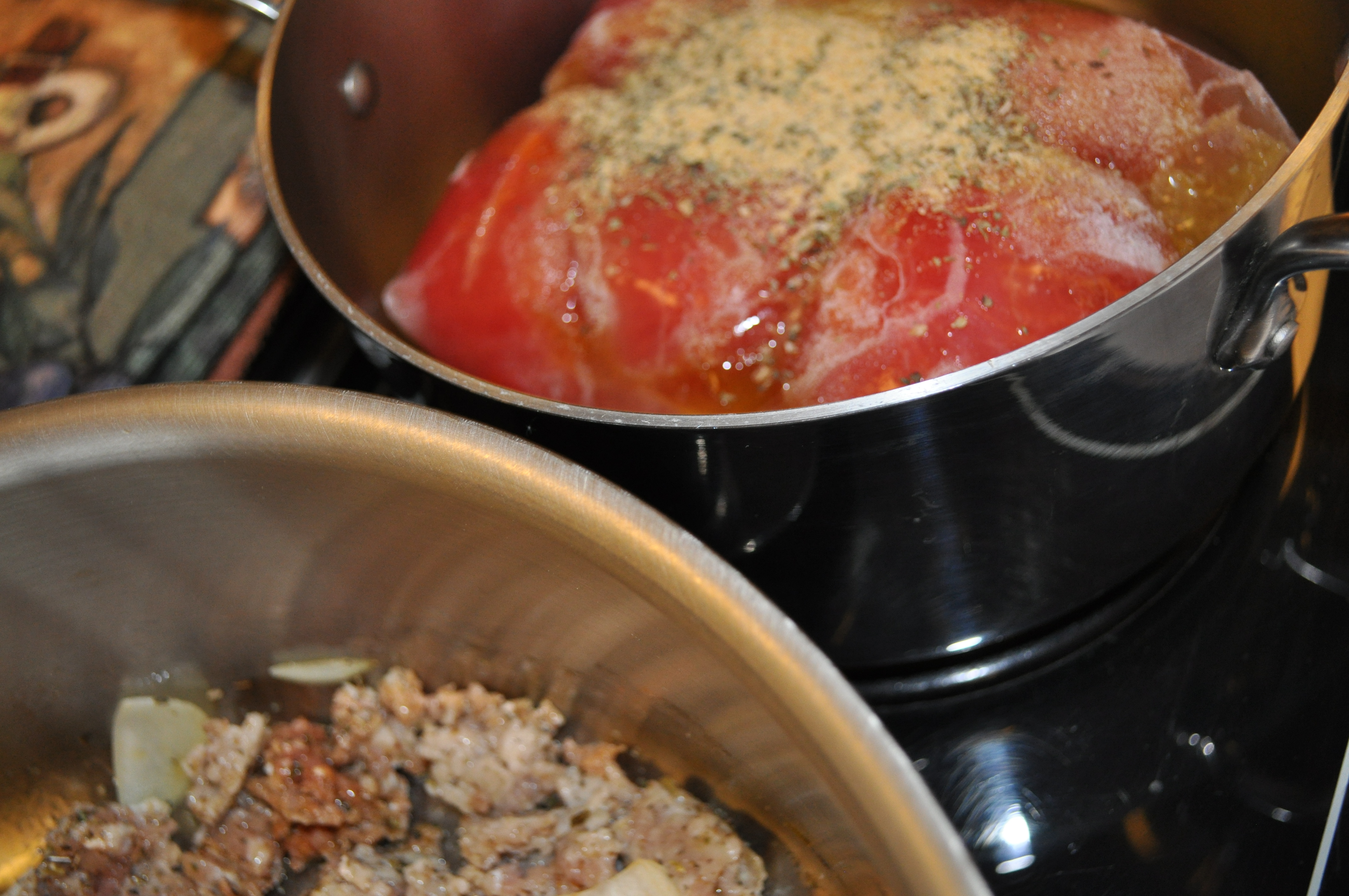 Note that if you had tried to make tomato sauce with frozen whole tomatoes, it would have been extremely watery. Here is a shot of the sauce pan, with the tomato puree, the sausage mix, and as I was adding tomatoes from the other pan.