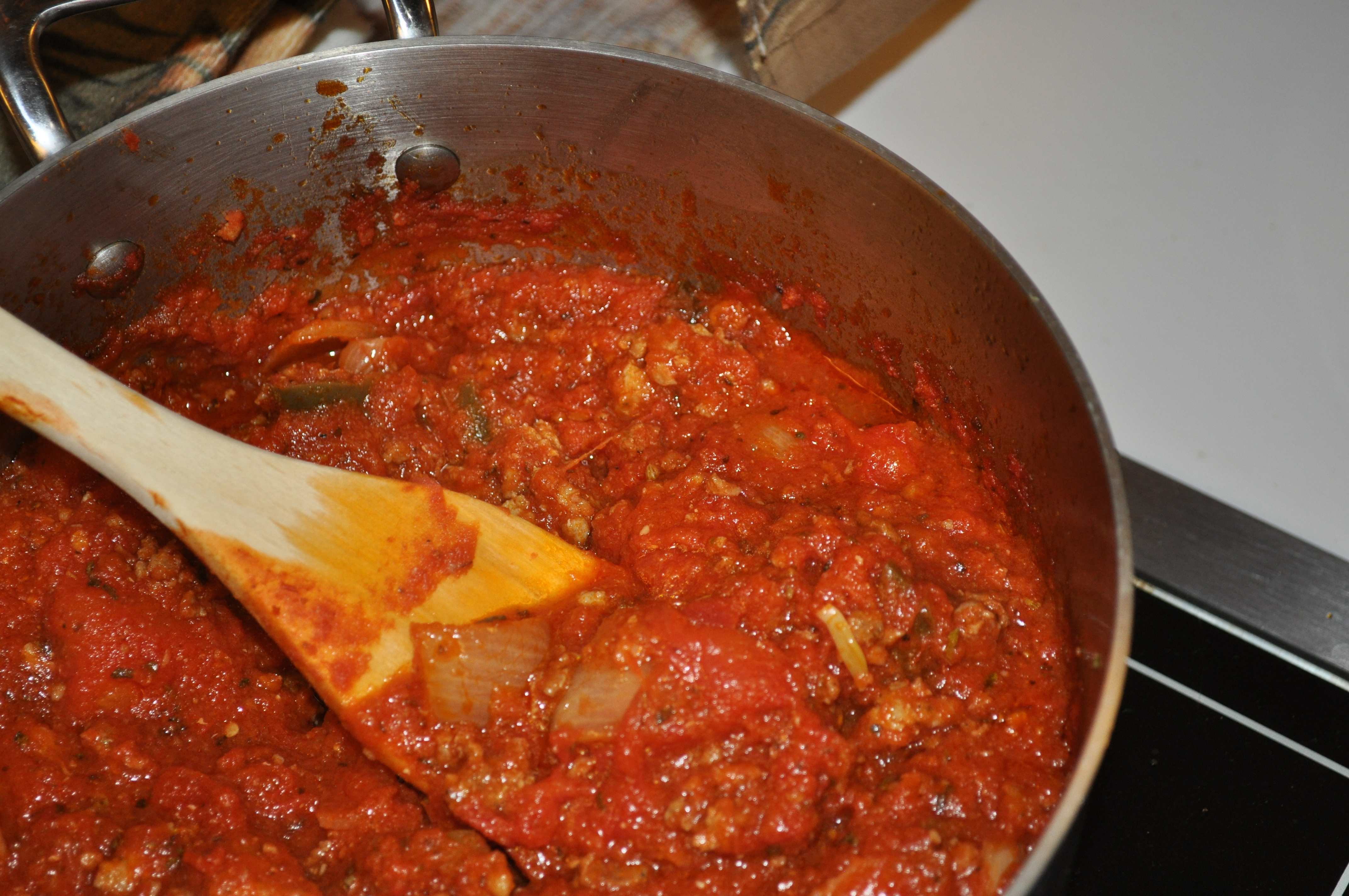 This is the type of thick meaty tomato sauce that is perfect for lasagna, or as a filling for ravioli or shells.