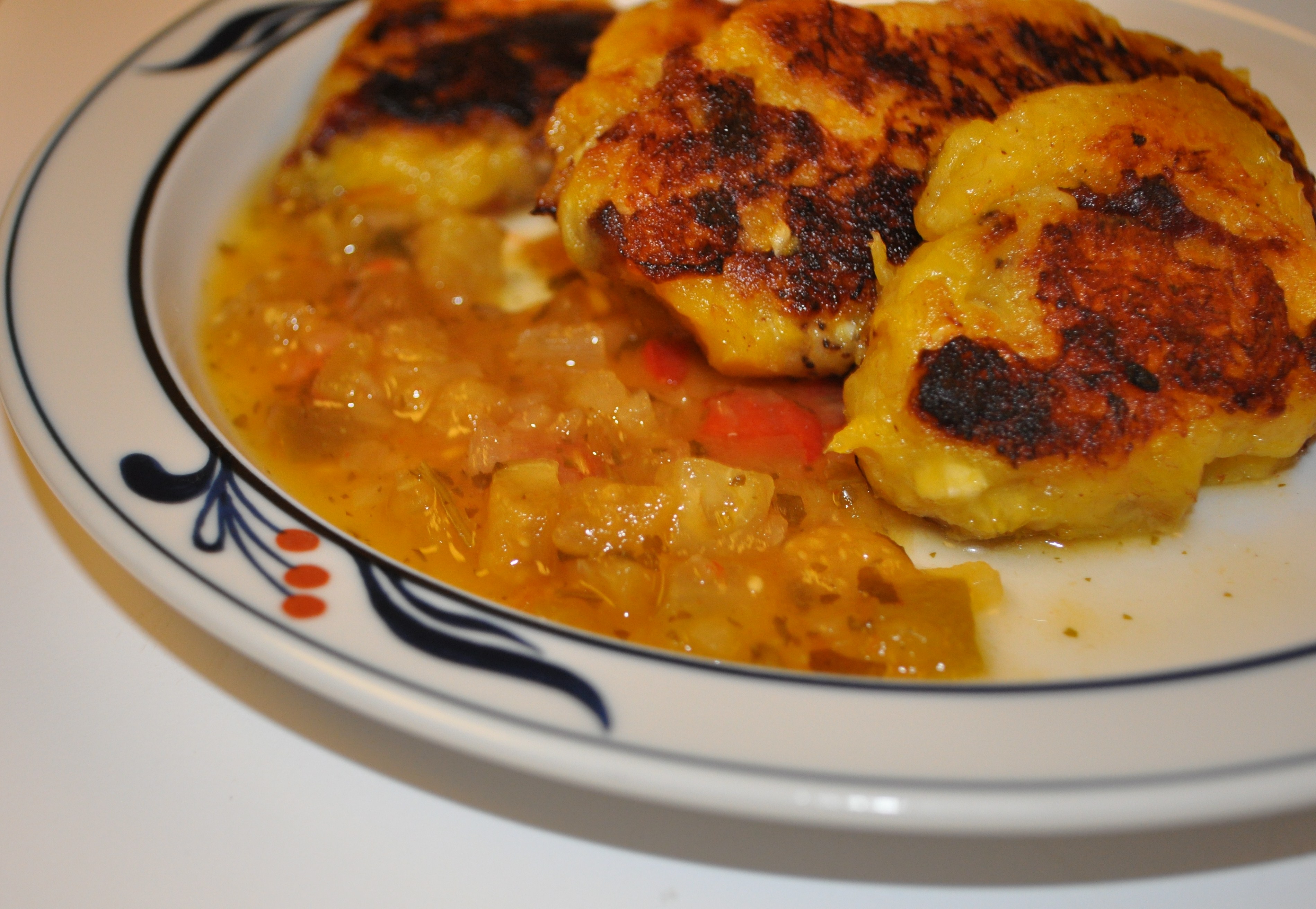 The plantains were not green. Like the recipes call for. They were getting ripe. That just meant they were quicker to cook in the salted water. I have to admit I really liked this dish. It does need more garlic though. I think I underdid the garlic.