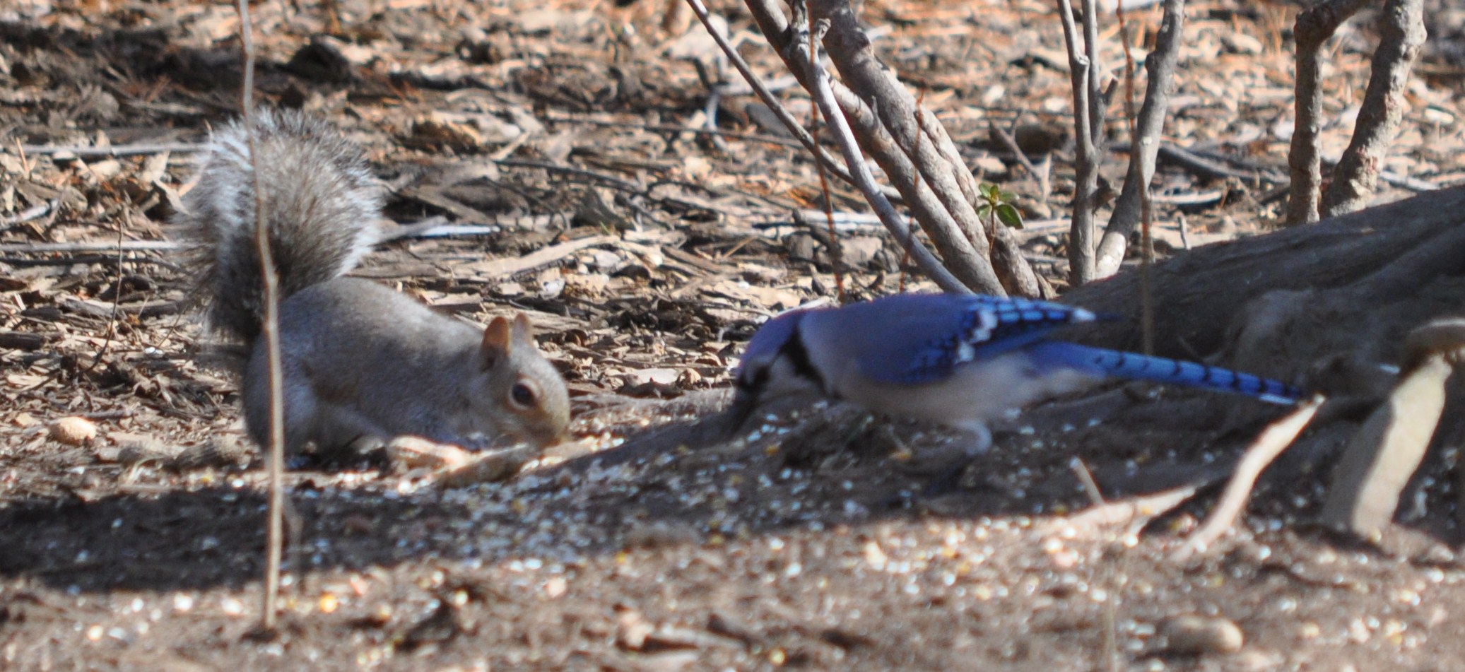Of course, with peanuts out there, at some point the squirrel showed up and the blue jays had to go into overdrive to get the lion’s share of the peanuts.