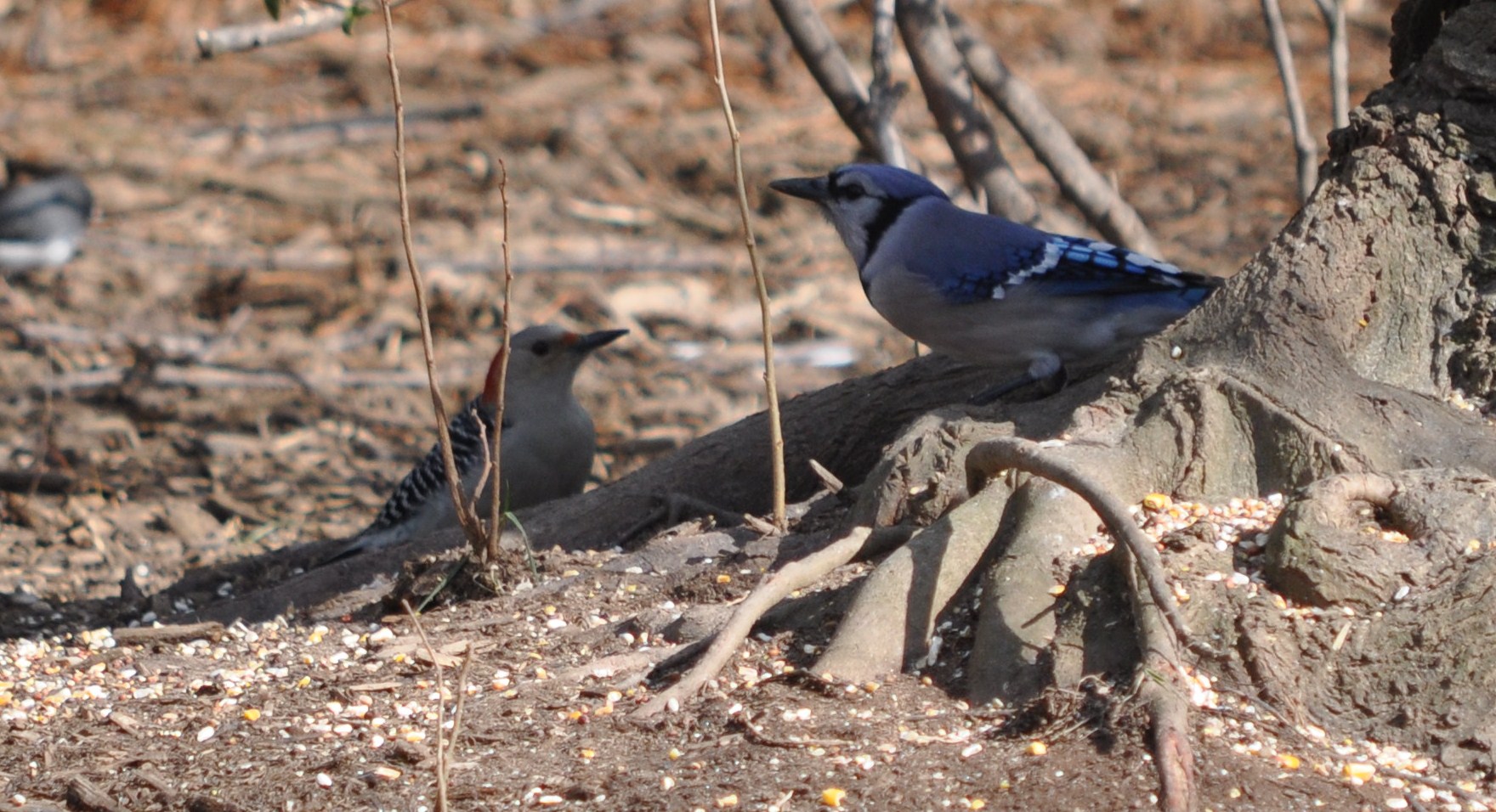 Don’t know where the males were today, but the females kept coming back. I also put peanuts in the shell out there today to check out the blue jays. I had at least six between those on the ground and in the trees. They are a riot to watch, as they go looking for the biggest and heaviest peanuts. Last year there were fewer blue jays reported. Including by me. This year they are back.