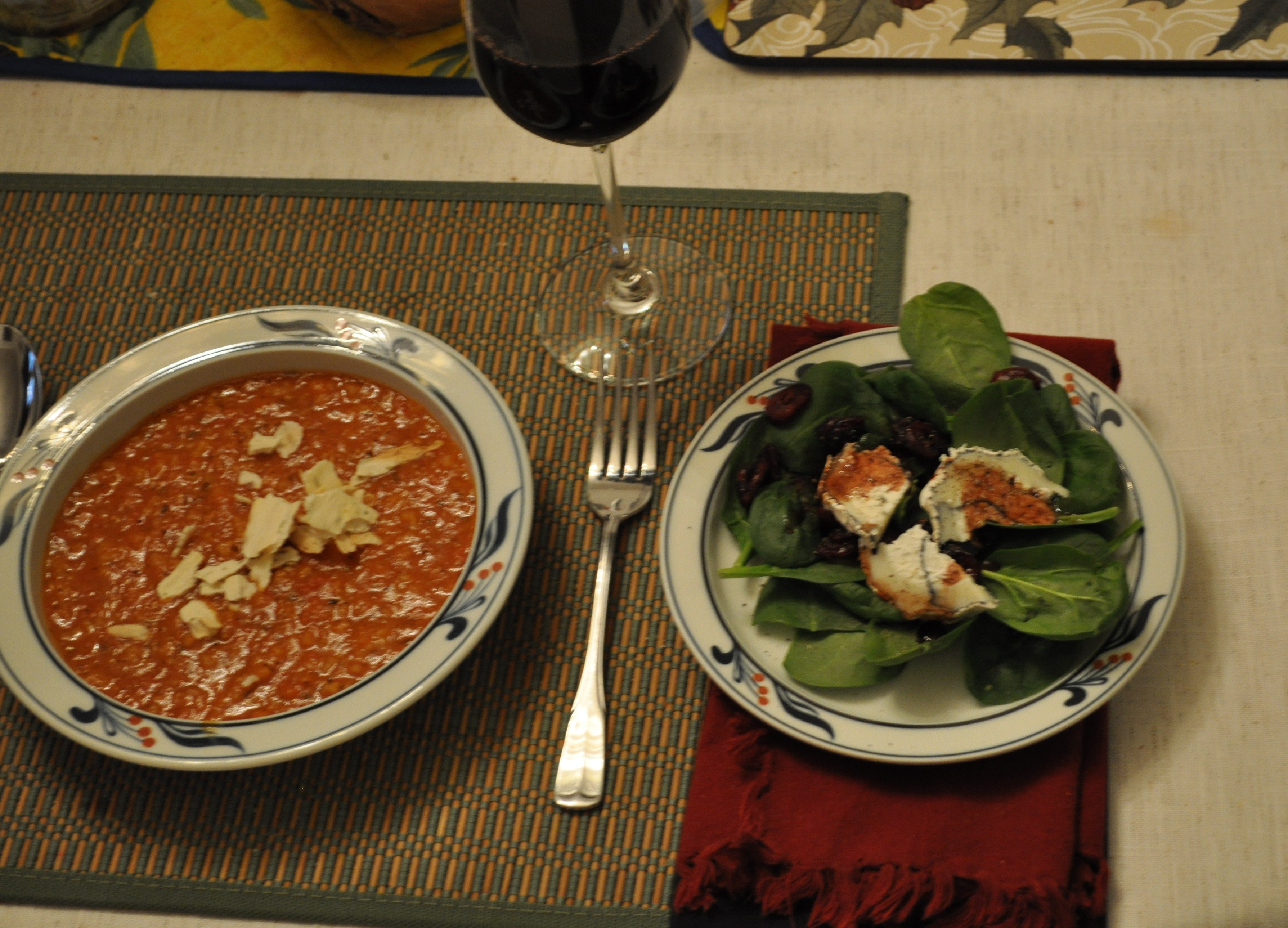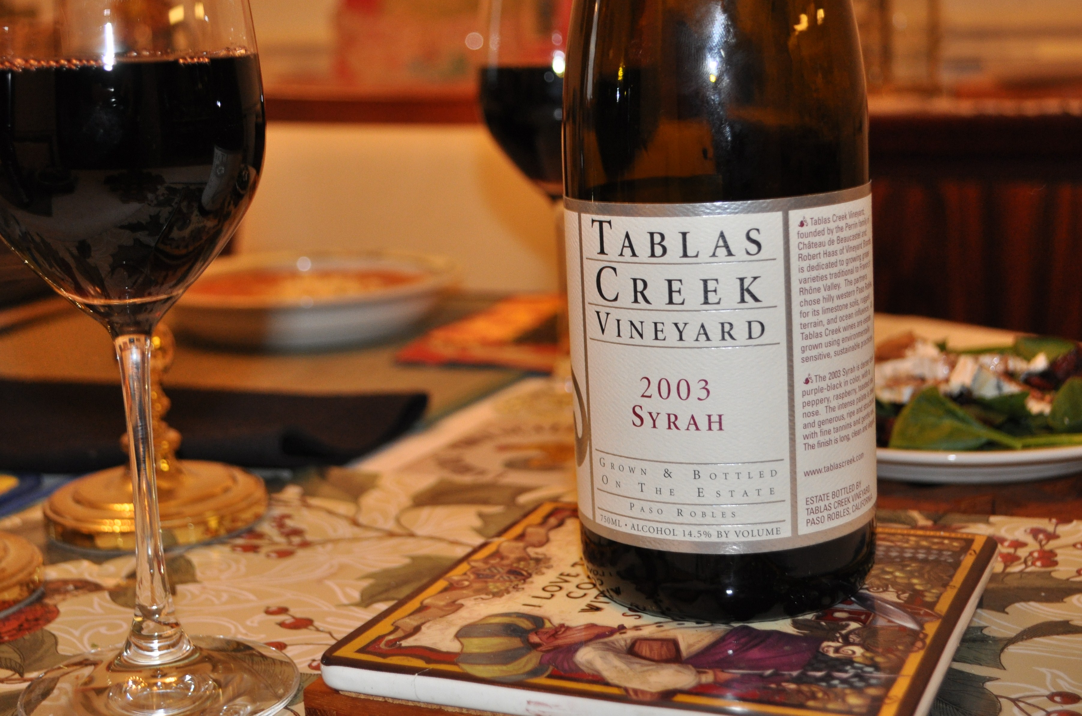 Tablas Creek syrah. 2003 vintage. Hard to believe it is ten years old. Big, balanced, with a hint of berries in the nose. It went well with the soup and the salad. A simple soup and salad dinner elevated to the next level with a great wine and completely made from scratch. Including the berry vinaigrette on the salad.